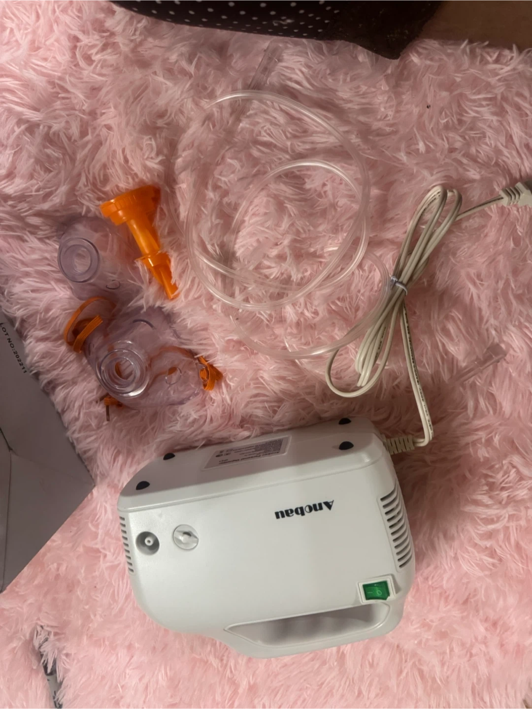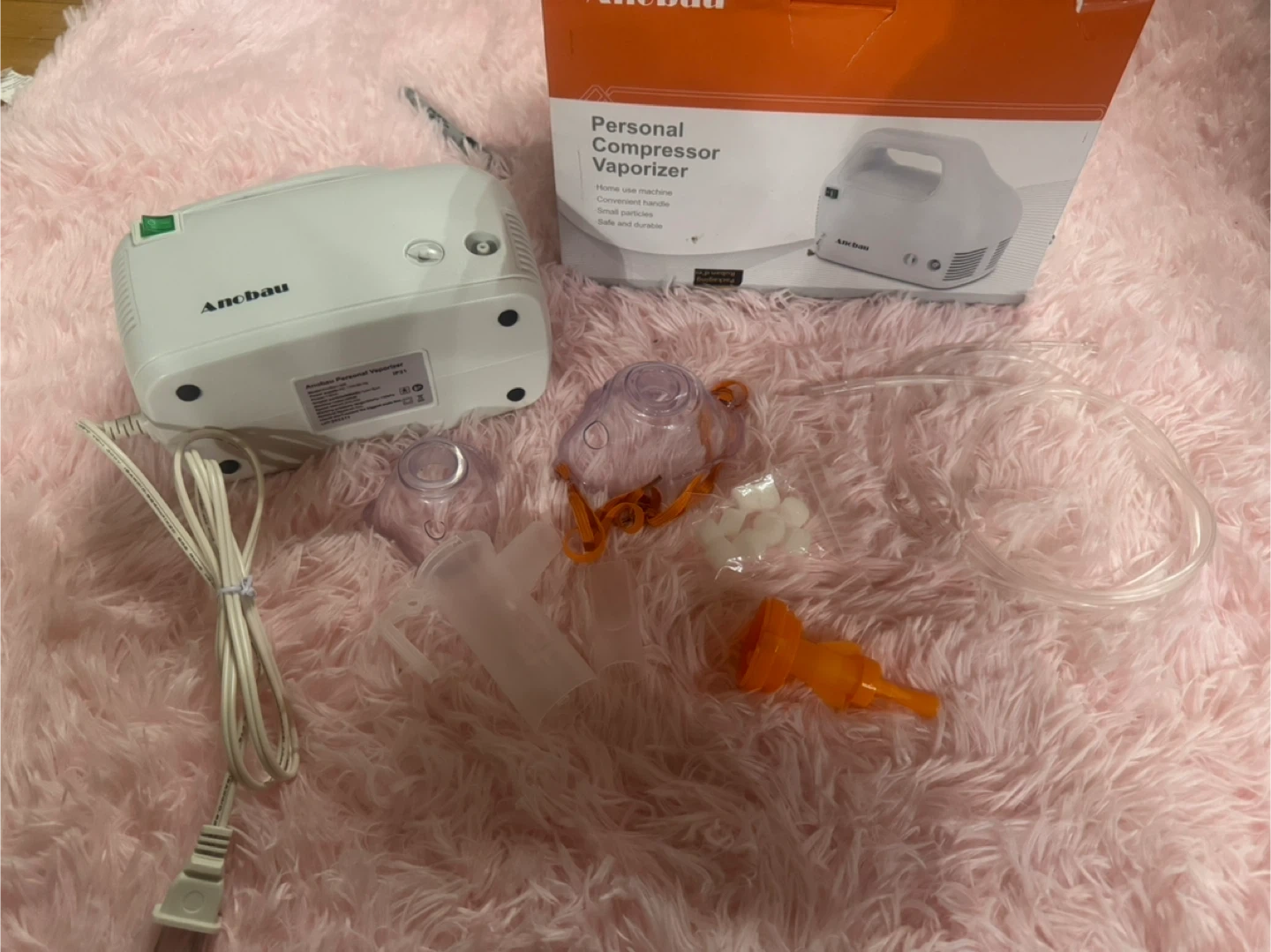 This Anobau personal compressor vaporizer is a home use machine. It's designed with a convenient handle and produces small particles. Includes essential accessories for operation.