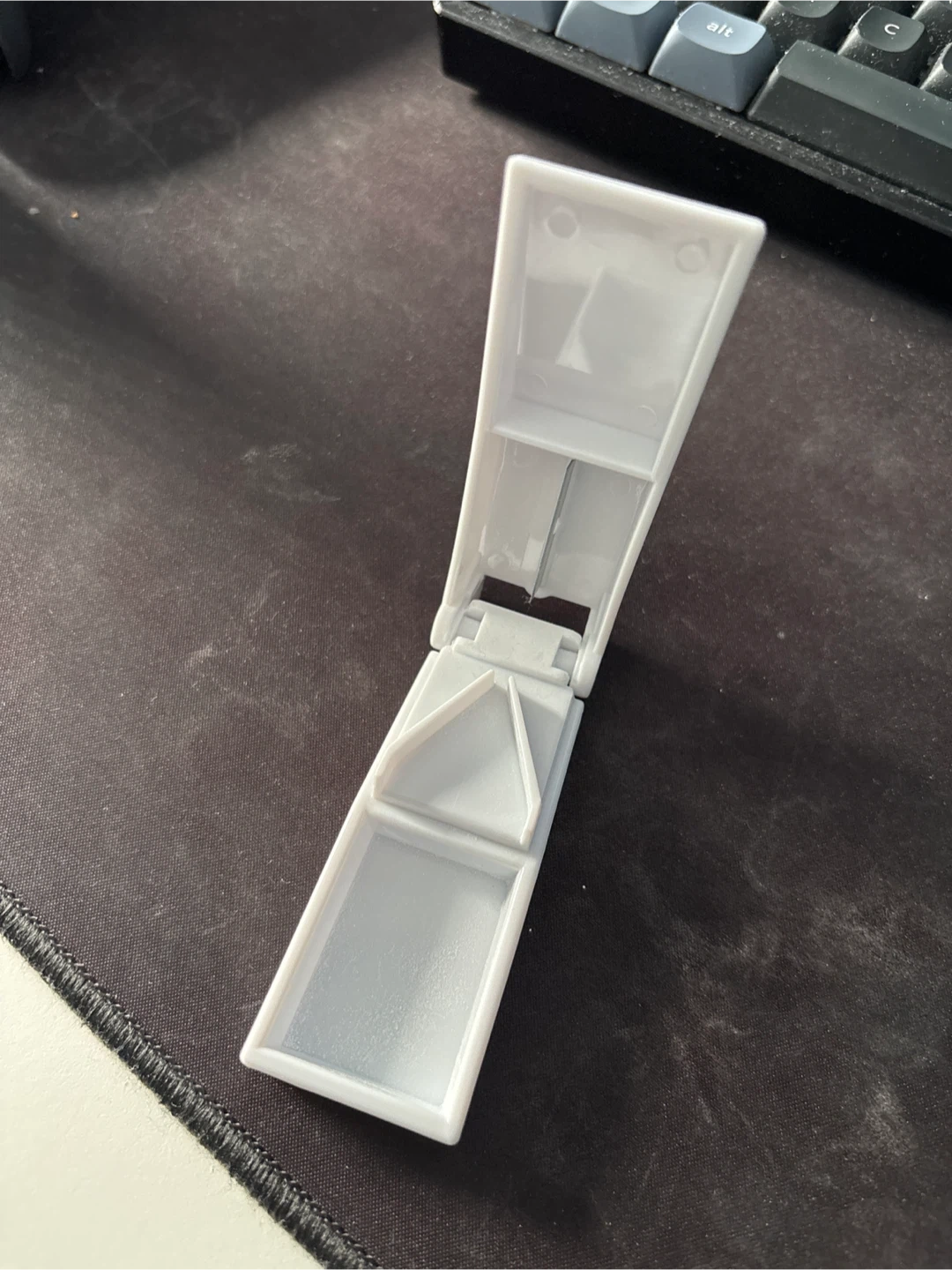 This pill cutter is white and made of plastic. It has a blade for splitting pills. It's useful for when you need to take half a pill.