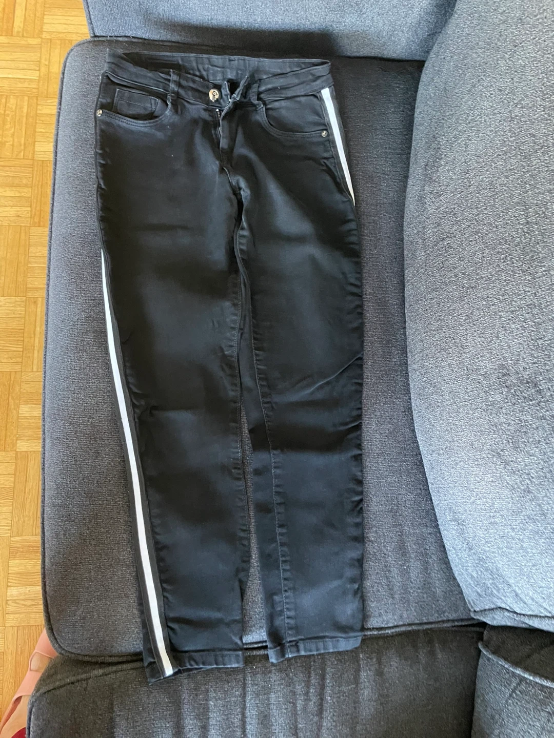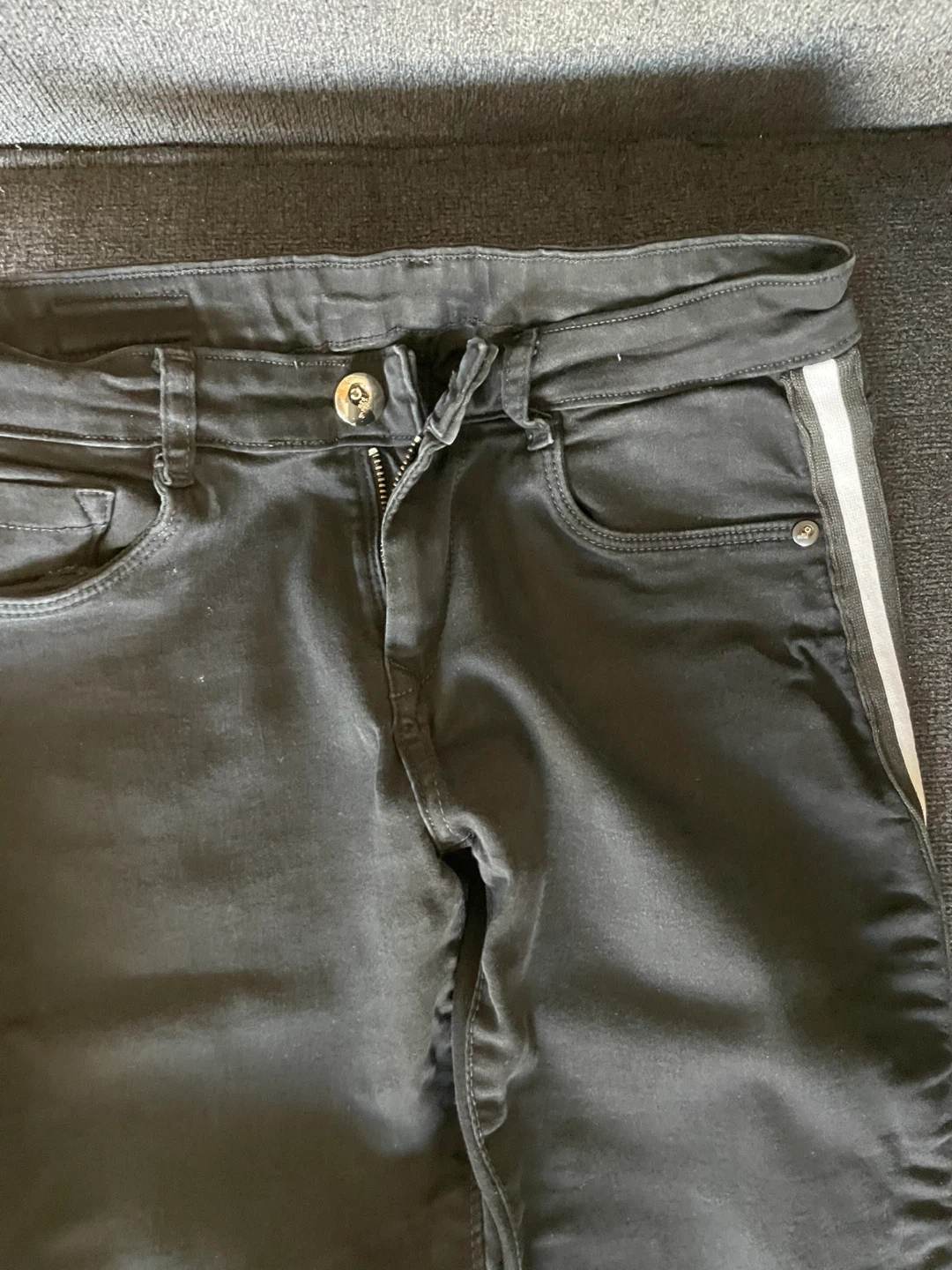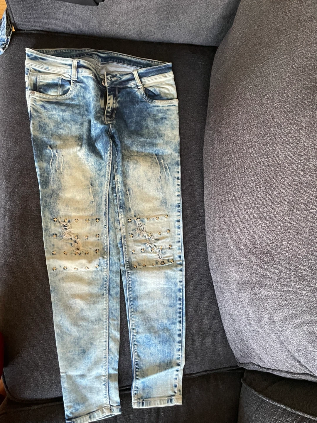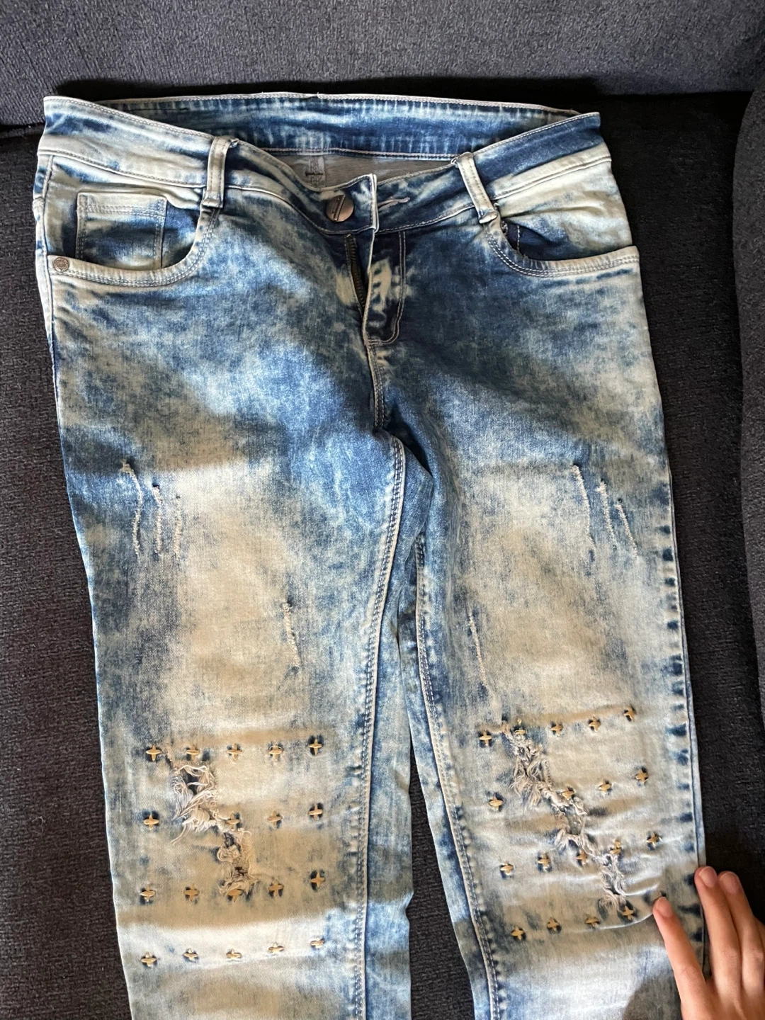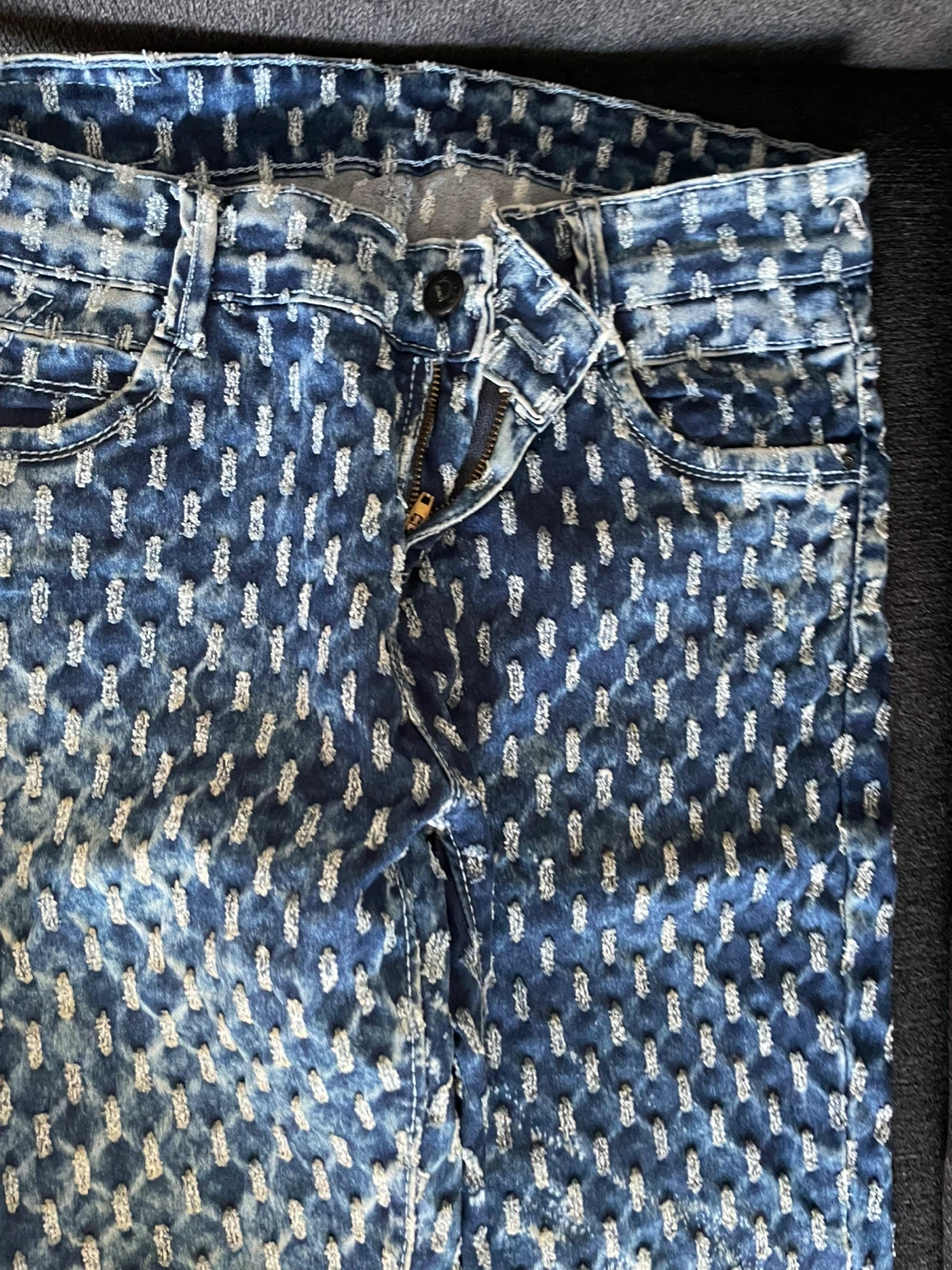 These blue wash jeans feature a distressed look with added studs around the ripped areas. They have a unique all-over pattern that stands out. A cool choice for casual wear!