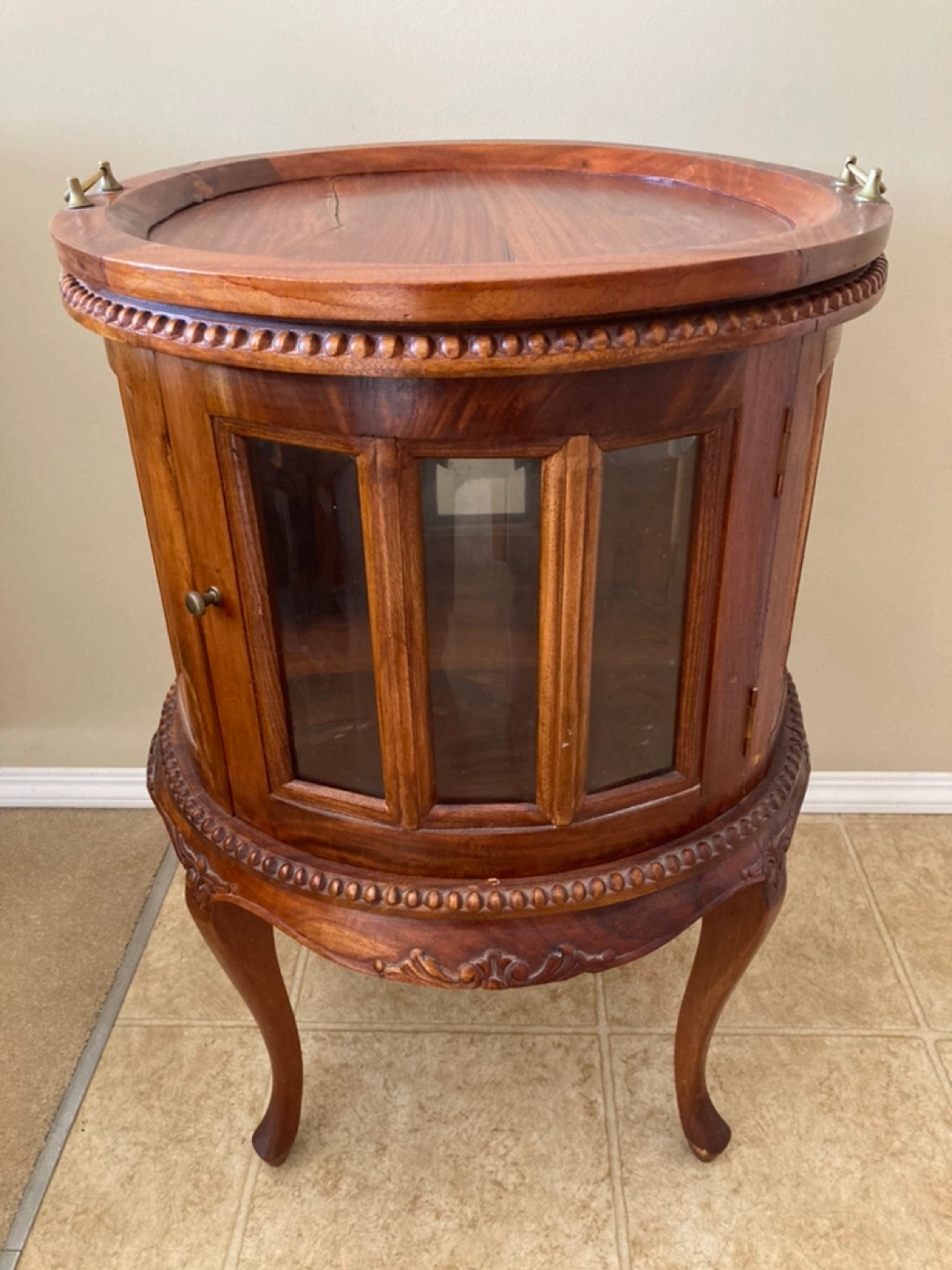 Round wooden table with a glass door. The table top is removable. Ornate carving on legs and top. Price $100.00