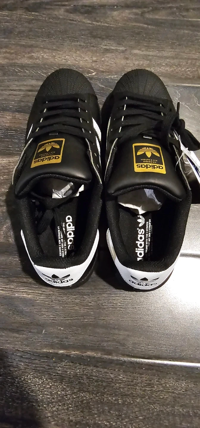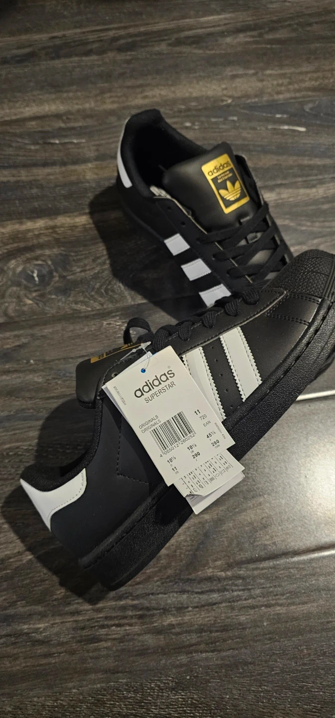 Classic Adidas Superstar sneakers in black with white stripes. These shoes feature a rubber shell toe for durability. Lace closure for a secure fit. Great for everyday wear!