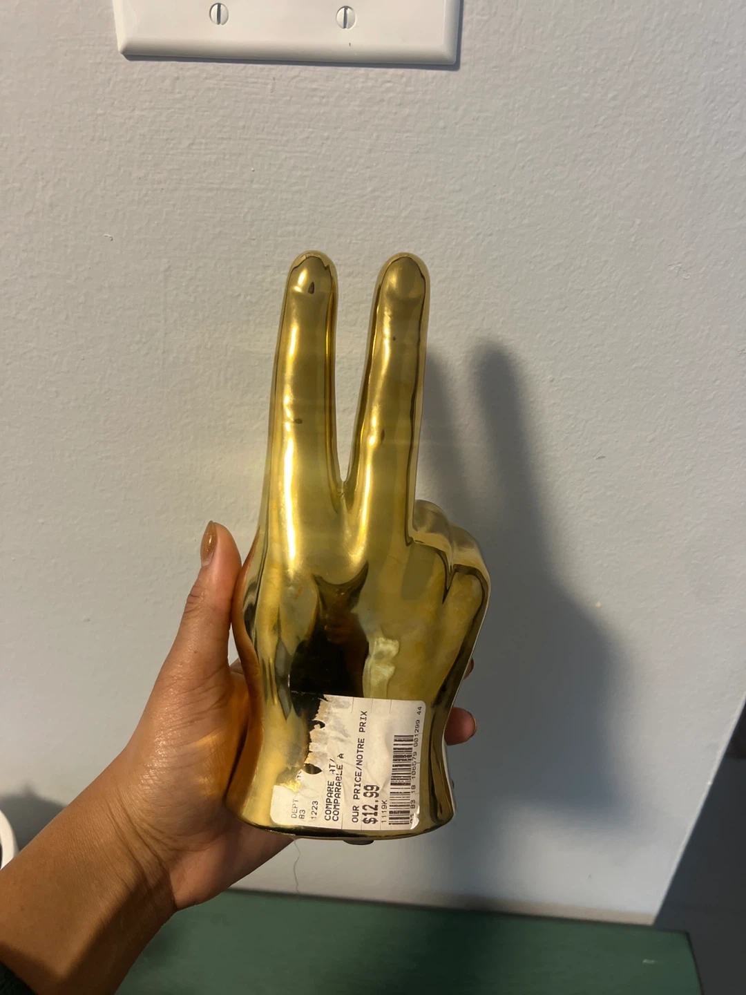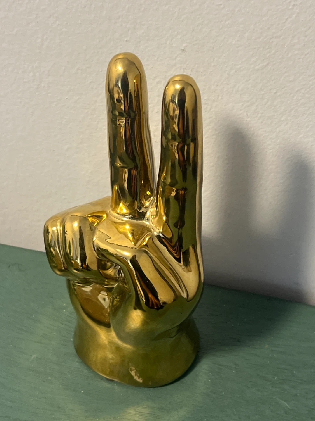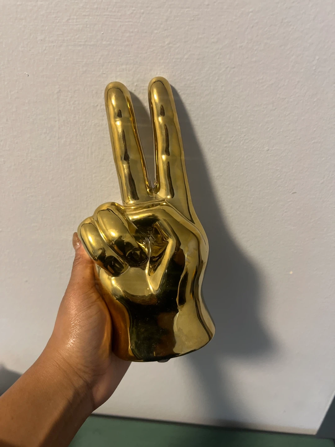 Add a touch of peace and style to your home with this gold peace sign hand decor! It's a unique piece that's sure to catch the eye. Originally priced at $12.99.