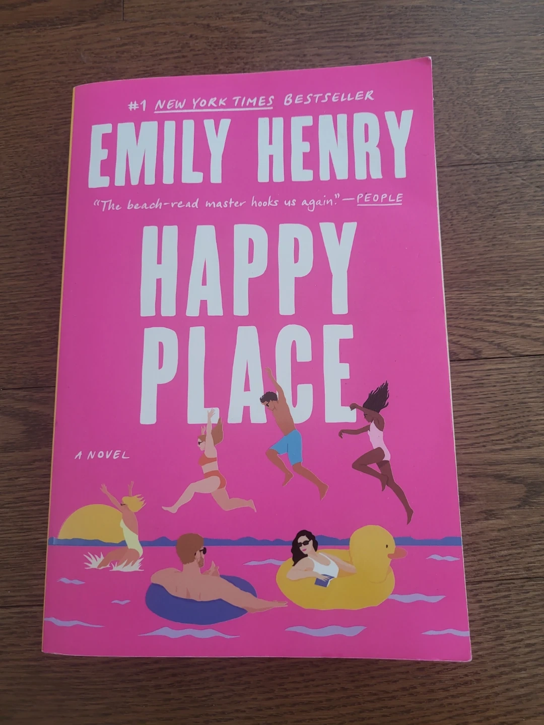 This is the novel "Happy Place" by Emily Henry. It's a contemporary romance about Harriet and Wyn. The book explores themes of friendship and love.
