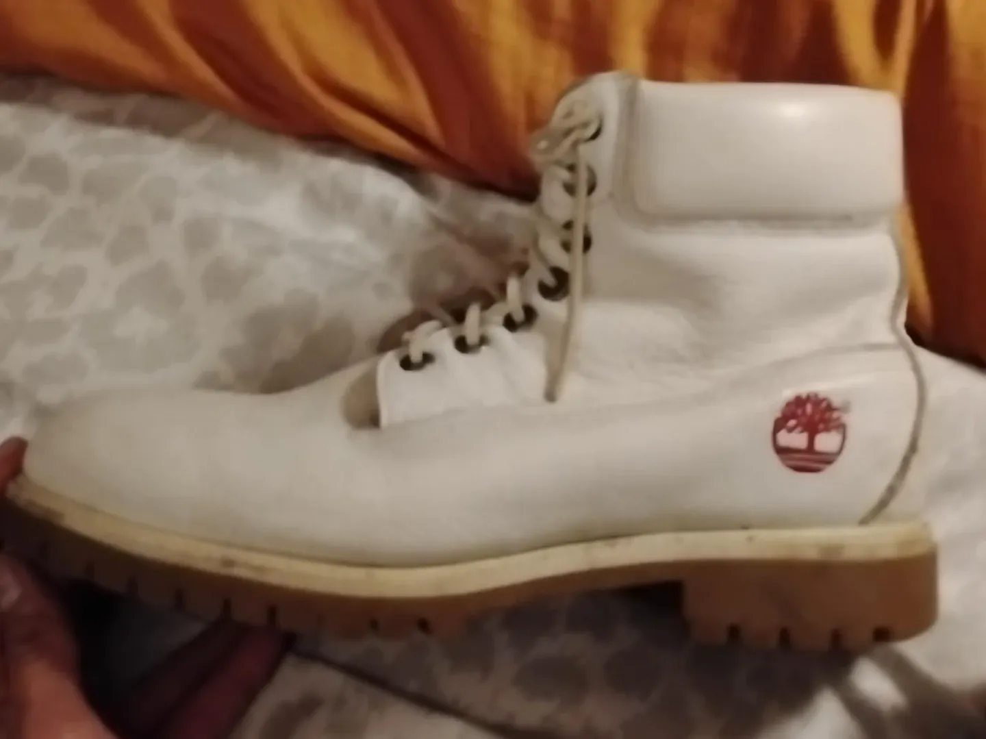 Selling a pair of Timberland boots in white! They're in good condition, with the classic Timberland logo visible. Great for all weather conditions