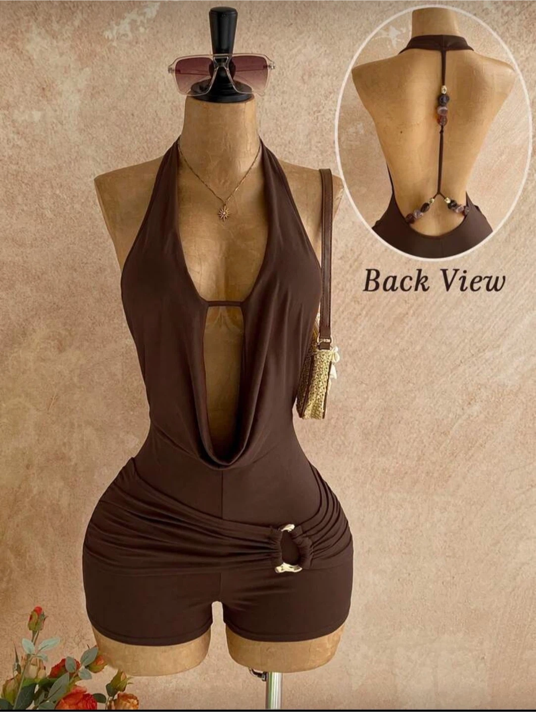 This stylish brown romper features a plunging halter neckline with a daring cutout. It's designed with ruching and a decorative buckle detail at the waist. The back boasts an intricate beaded strap design.