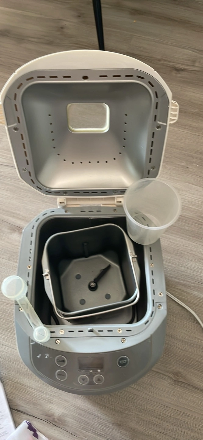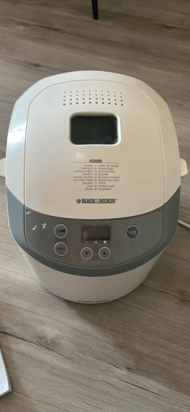 This Black & Decker bread maker is white and grey. It has 12 pre-programmed settings for different types of bread and dough. Includes measuring cups and a recipe booklet. Fresh bread in your home!