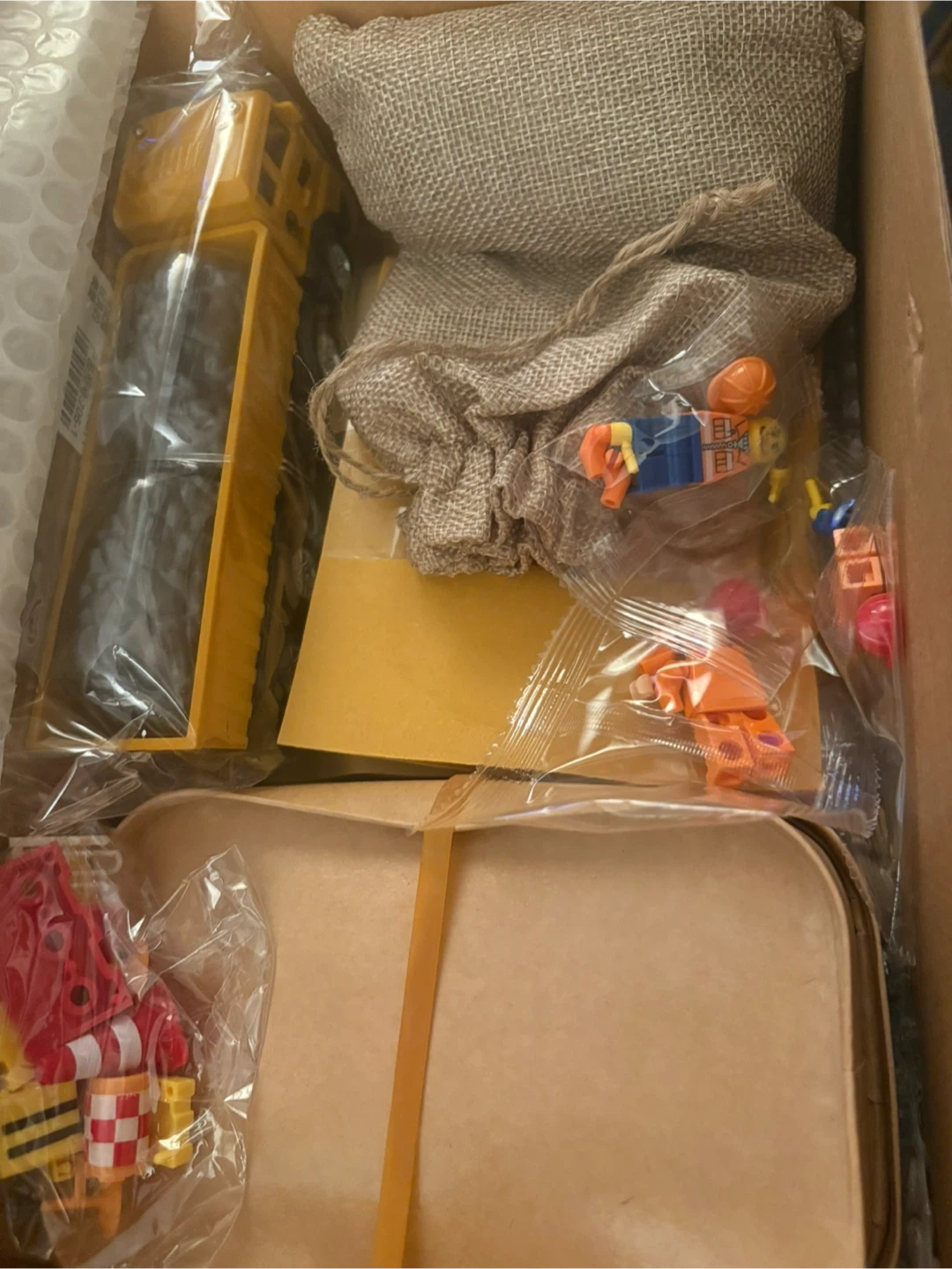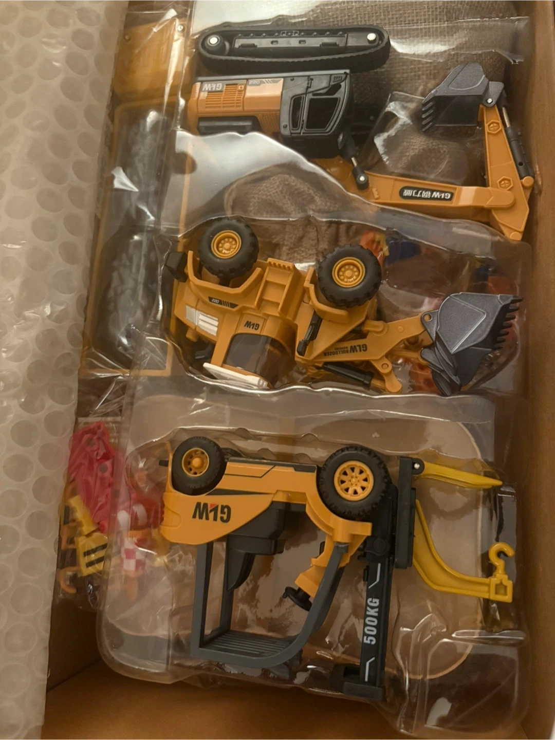 This set includes several construction vehicle toys. It looks like it comes with smaller figures as well. It's great for imaginative play for kids who love building and vehicles!