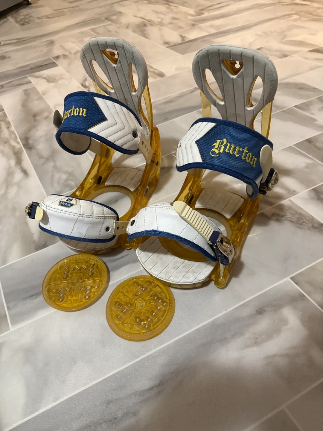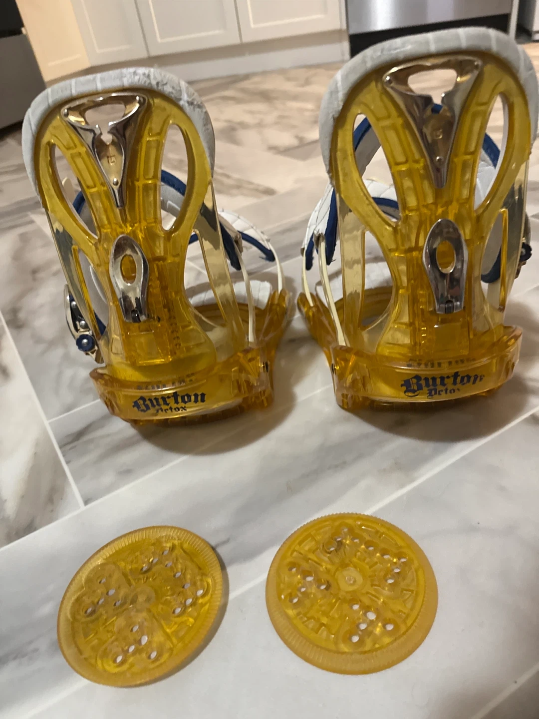 Burton Detonator snowboard bindings in a cool translucent yellow colour. These bindings feature comfortable straps and are designed for performance. Includes two yellow disc covers.