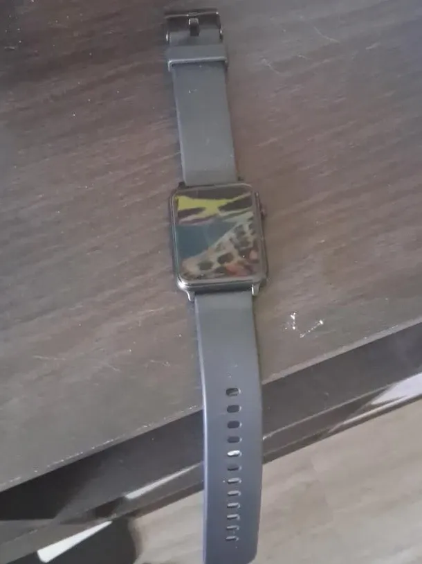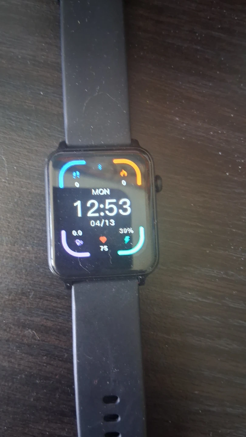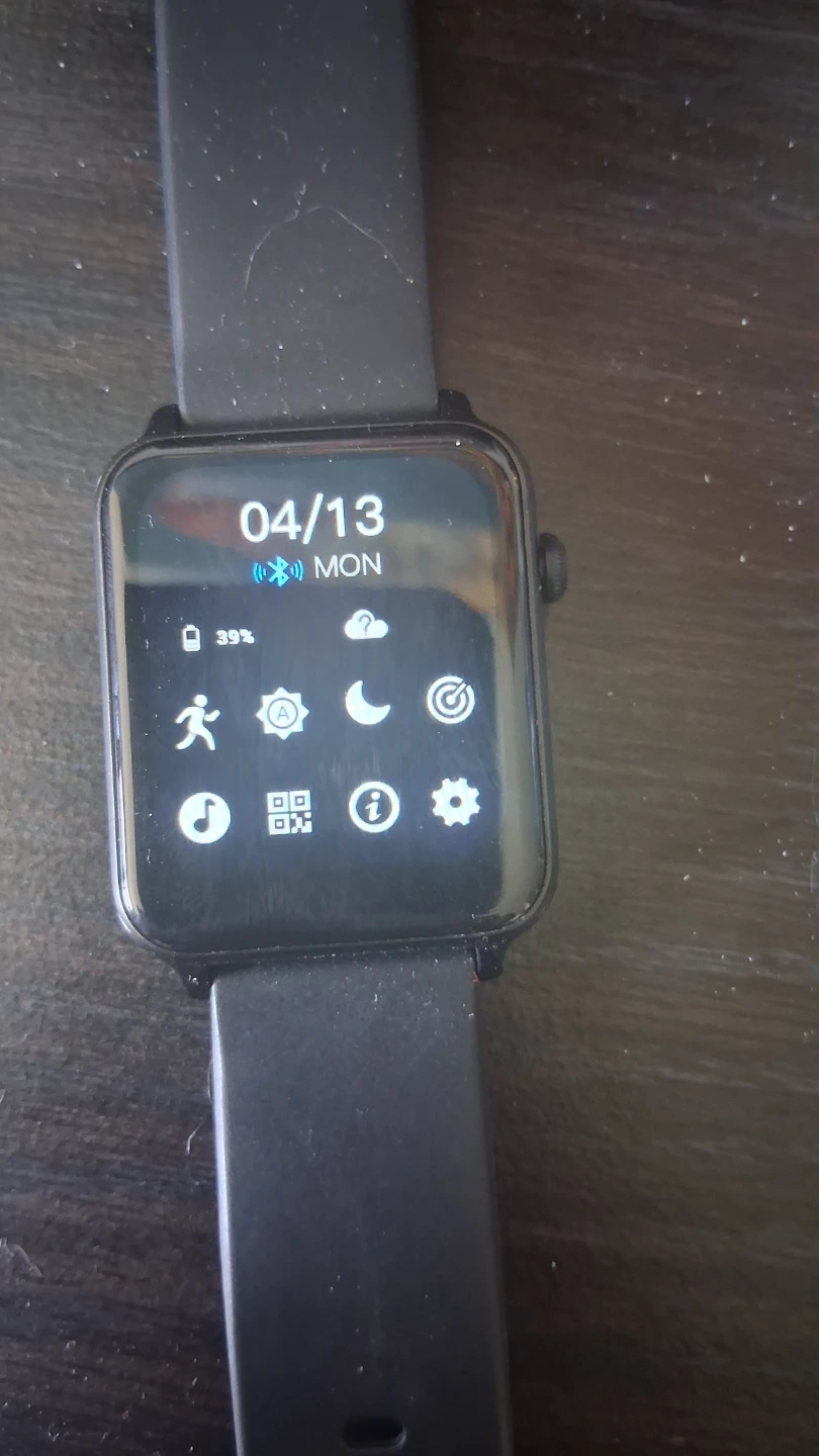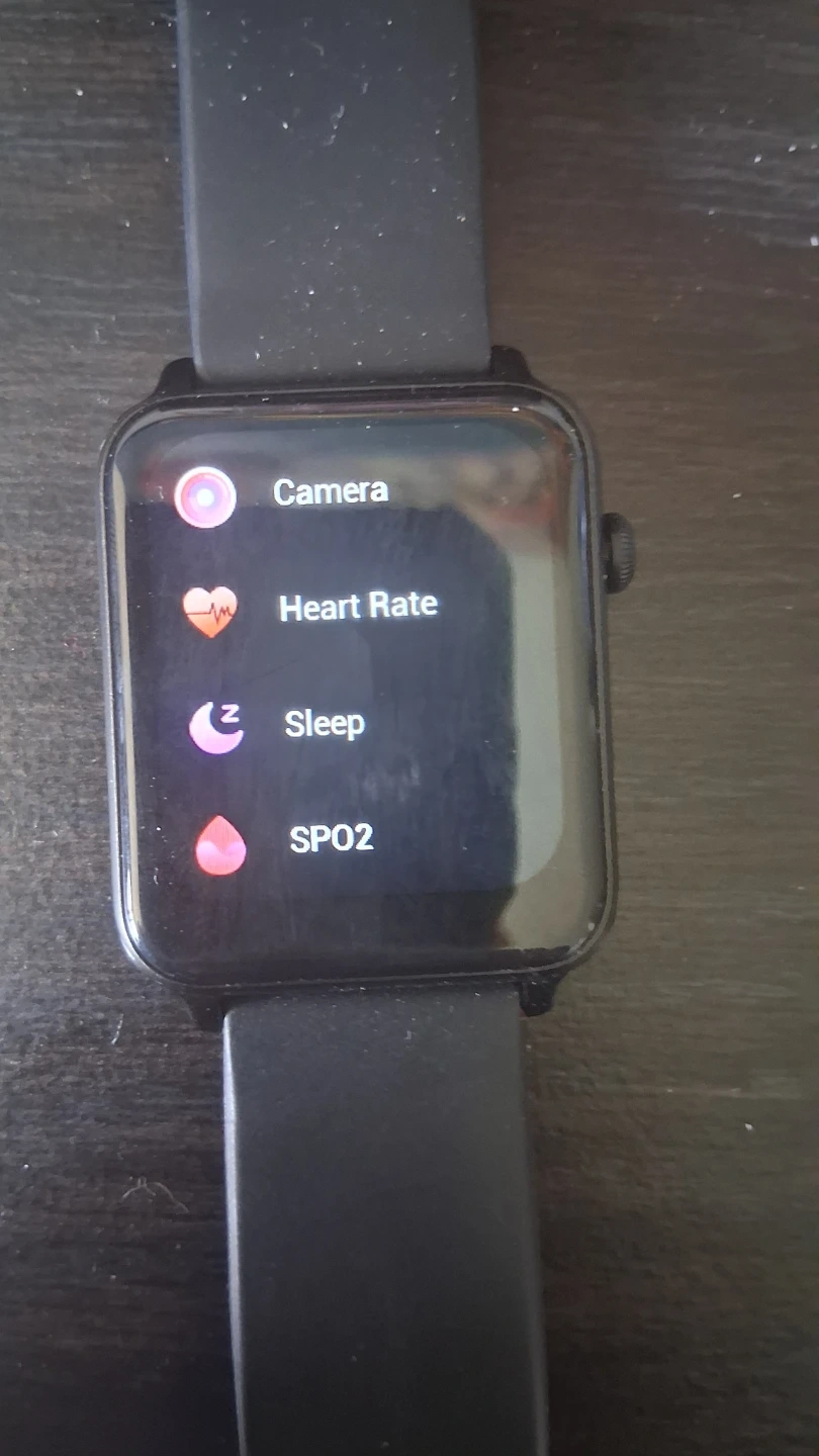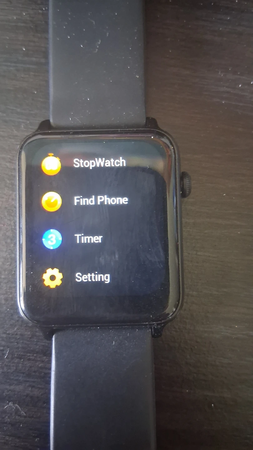 Black smartwatch with a silicone band. It has features like stopwatch, timer, find phone, heart rate monitoring, and sleep tracking. The screen displays time and date.