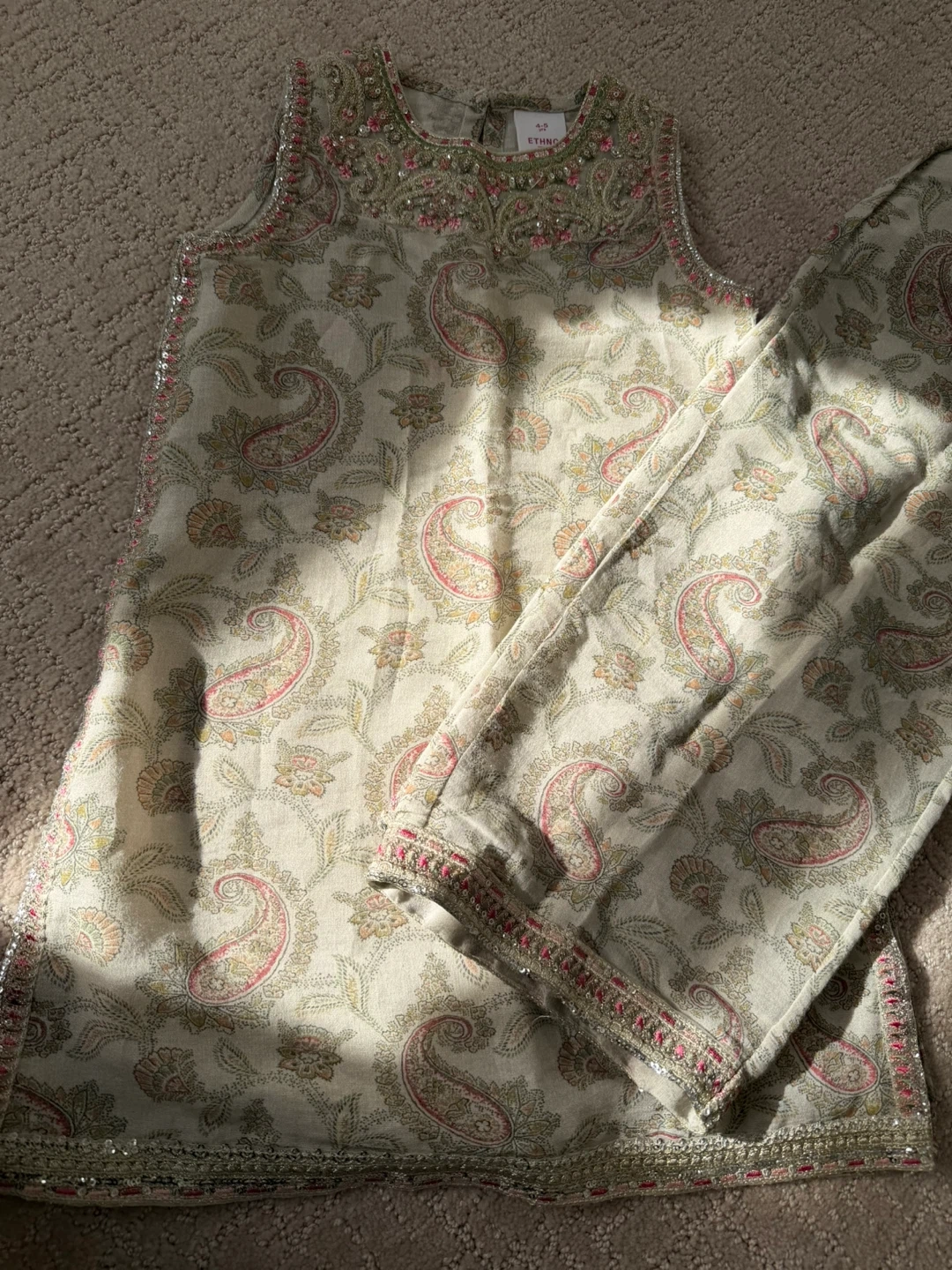 This Ethno kurta and pants set features a delicate pink paisley print. It's embellished with beads and sequins around the neckline and hem. Size is 4-5 years.