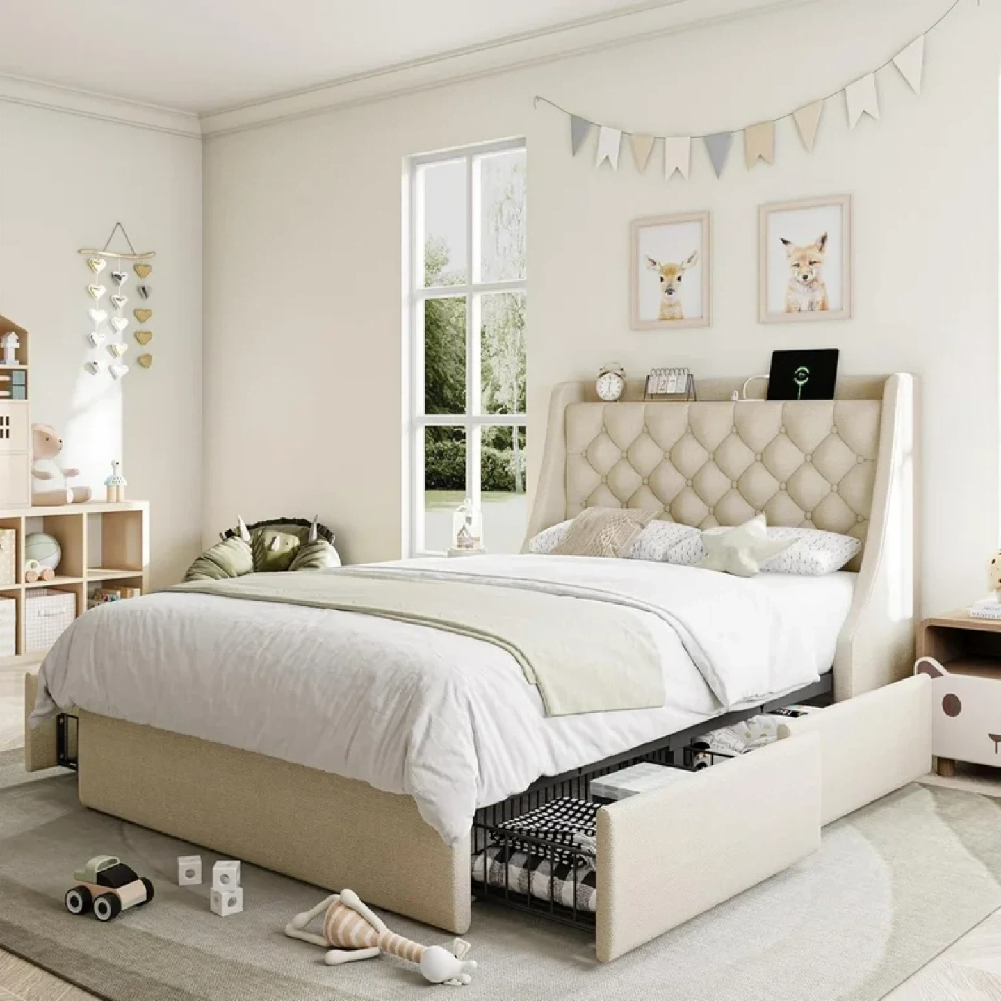 Multifunctional Aesthetic Wingback: 14" giant wingback prevents mattress sliding and greatly improve the stability of bed frame. Leaving enough space for nightstands, easily using drawers by the headboard