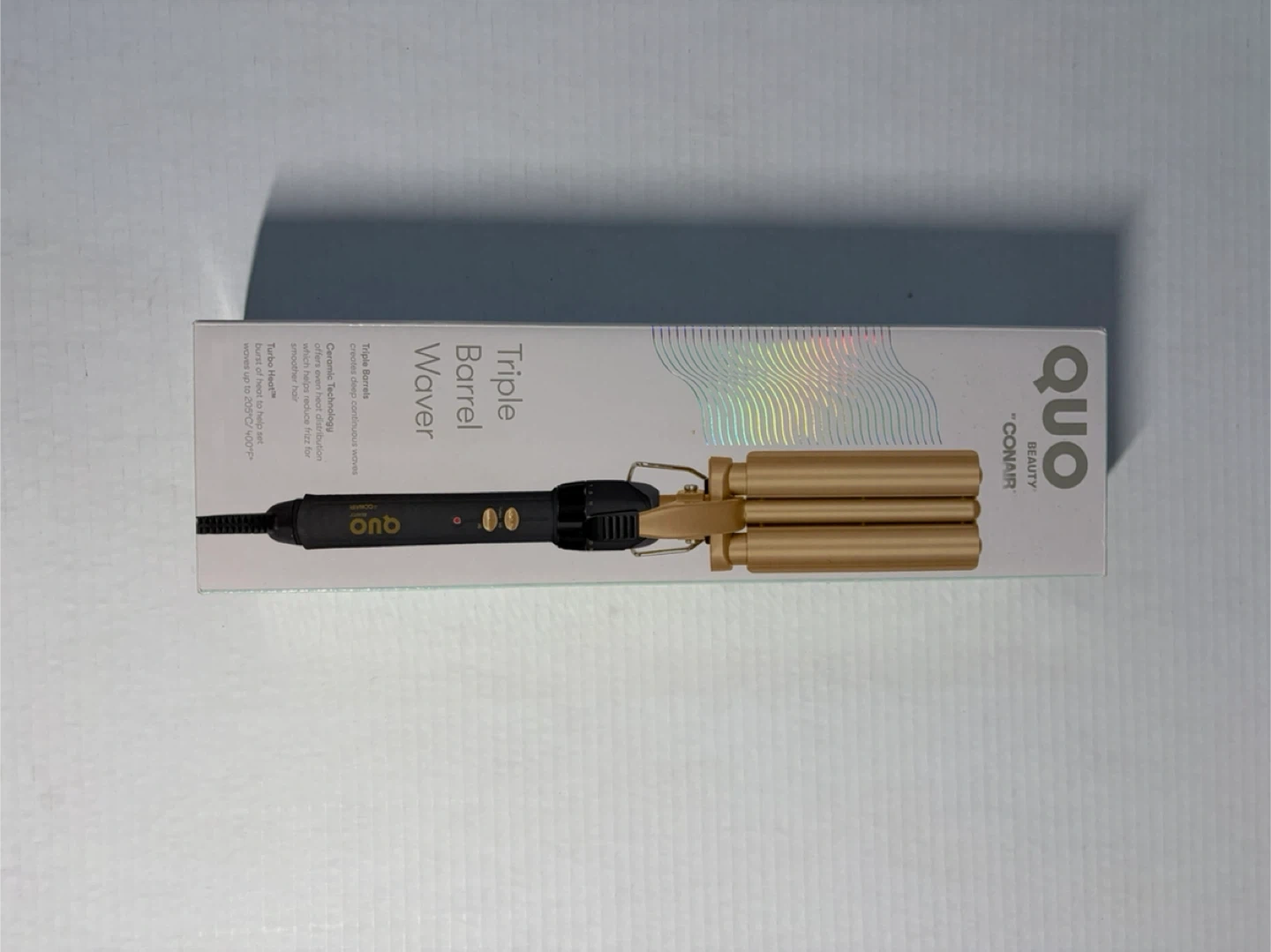 This QUO Beauty Triple Barrel Waver by Conair uses ceramic technology for consistent heat. It's designed to create beachy waves quickly. The waver has adjustable heat settings up to 400°F.