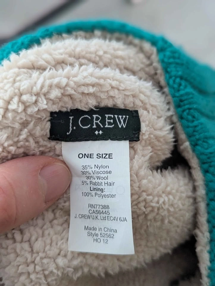 Cozy and stylish J.Crew knit hat in a beautiful teal shade. Features a soft cream sherpa lining for extra warmth and comfort, plus ear flaps with tie strings for a snug, secure fit. Made from a warm wool blend with rabbit hair for added softness.