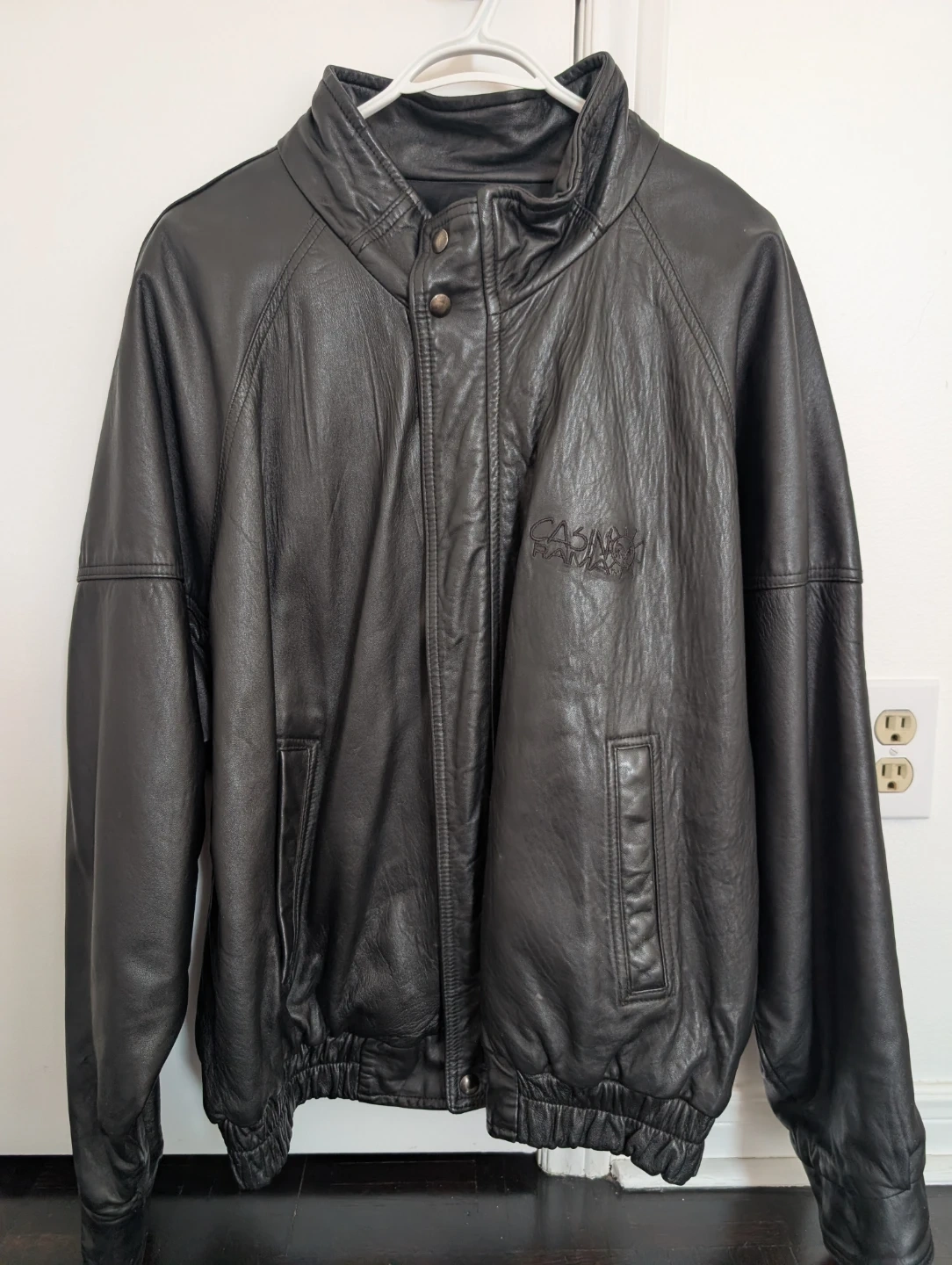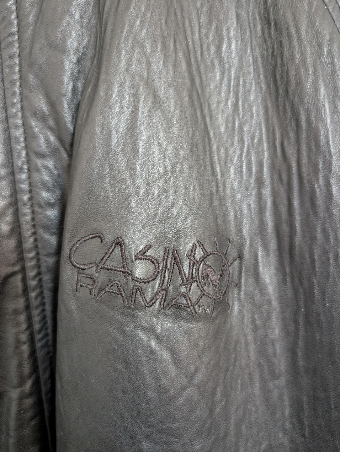 This is a black leather bomber jacket with embroidered "CASINO RAMA" logo. It features a full zip closure and elasticated cuffs and hem. Leather material. It is made in Canada!