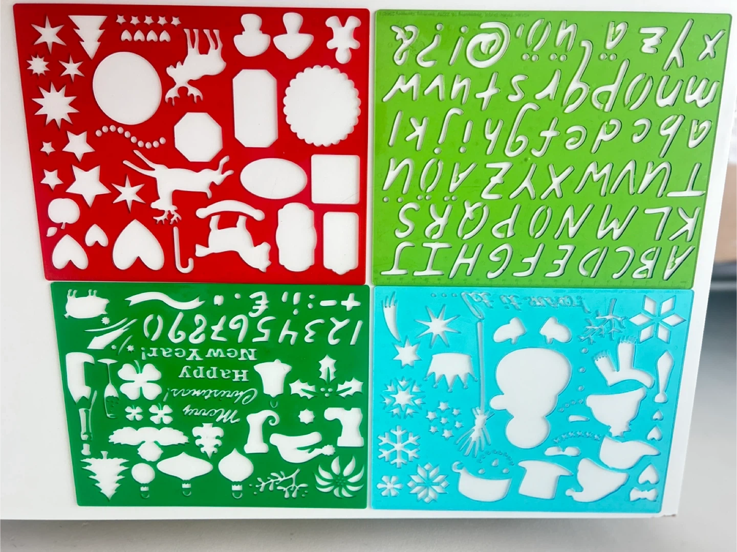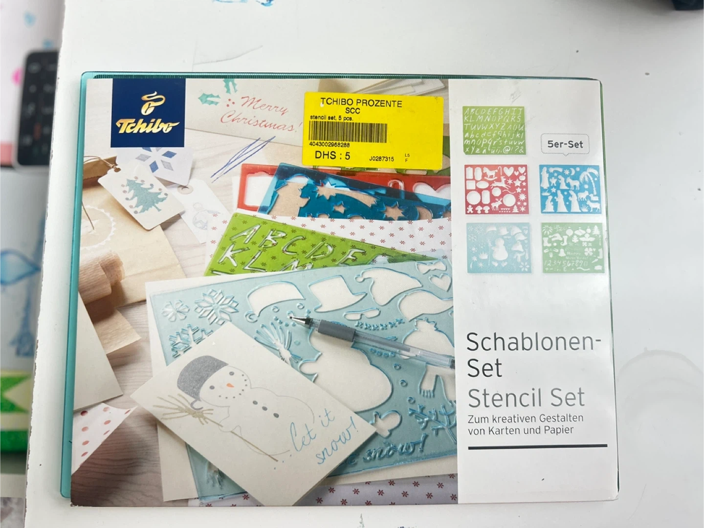 Selling a Tchibo ProZente SCC stencil set. It's a 5-piece set for creatively designing cards and paper. Includes stencils with letters, numbers, and holiday themes like Christmas and New Year's. Box is included!