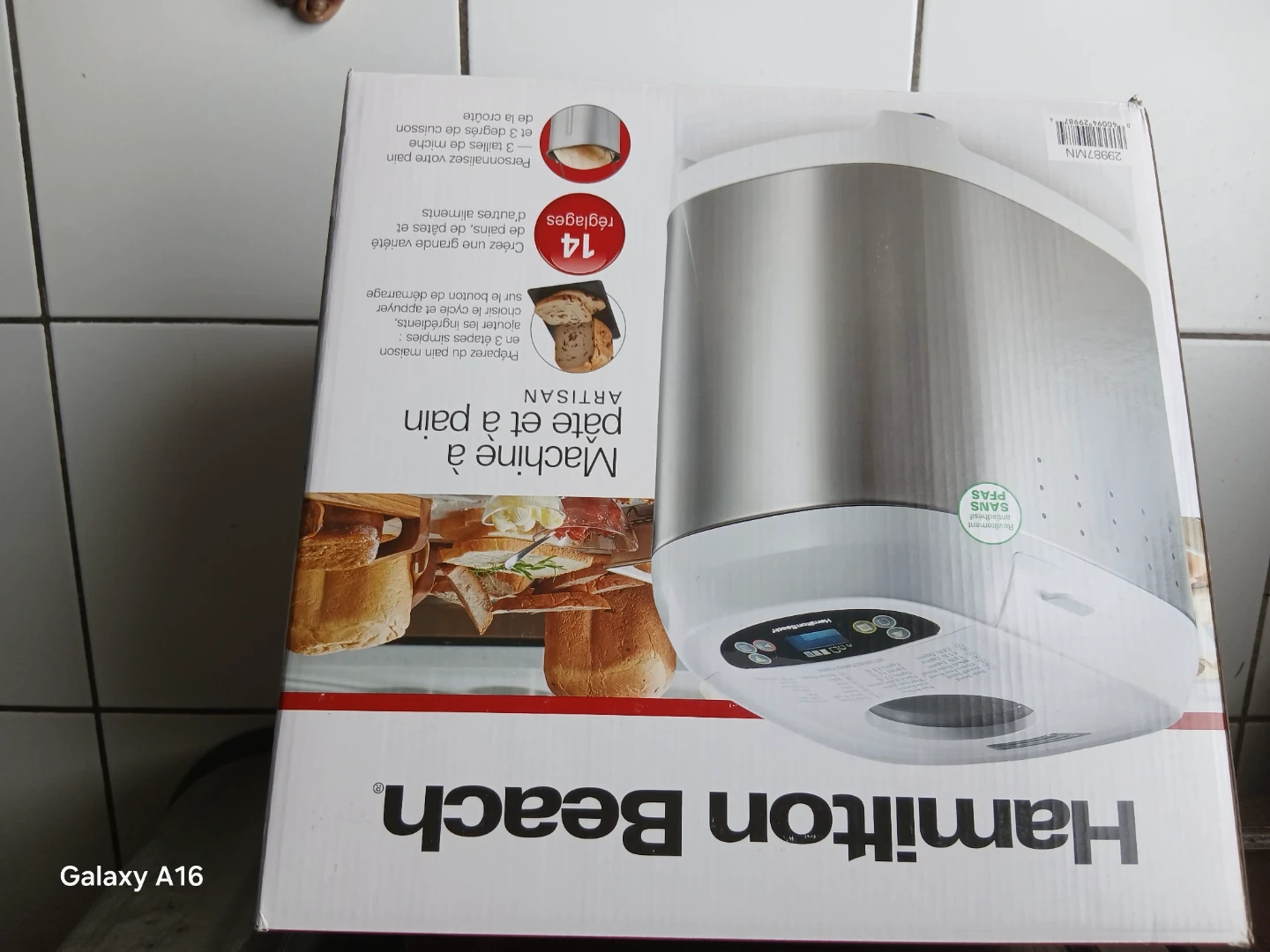 Hamilton Beach Artisan Dough & Bread Maker. It's a digital electric bread machine with 14 settings. It has a 2 lbs capacity and comes in white and stainless steel.