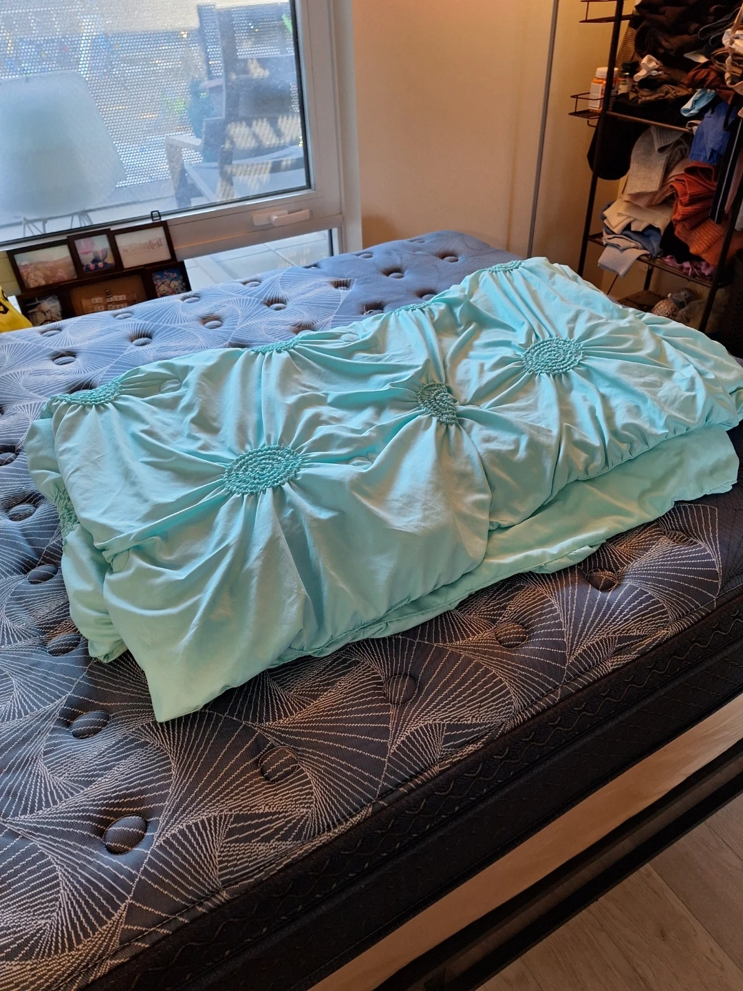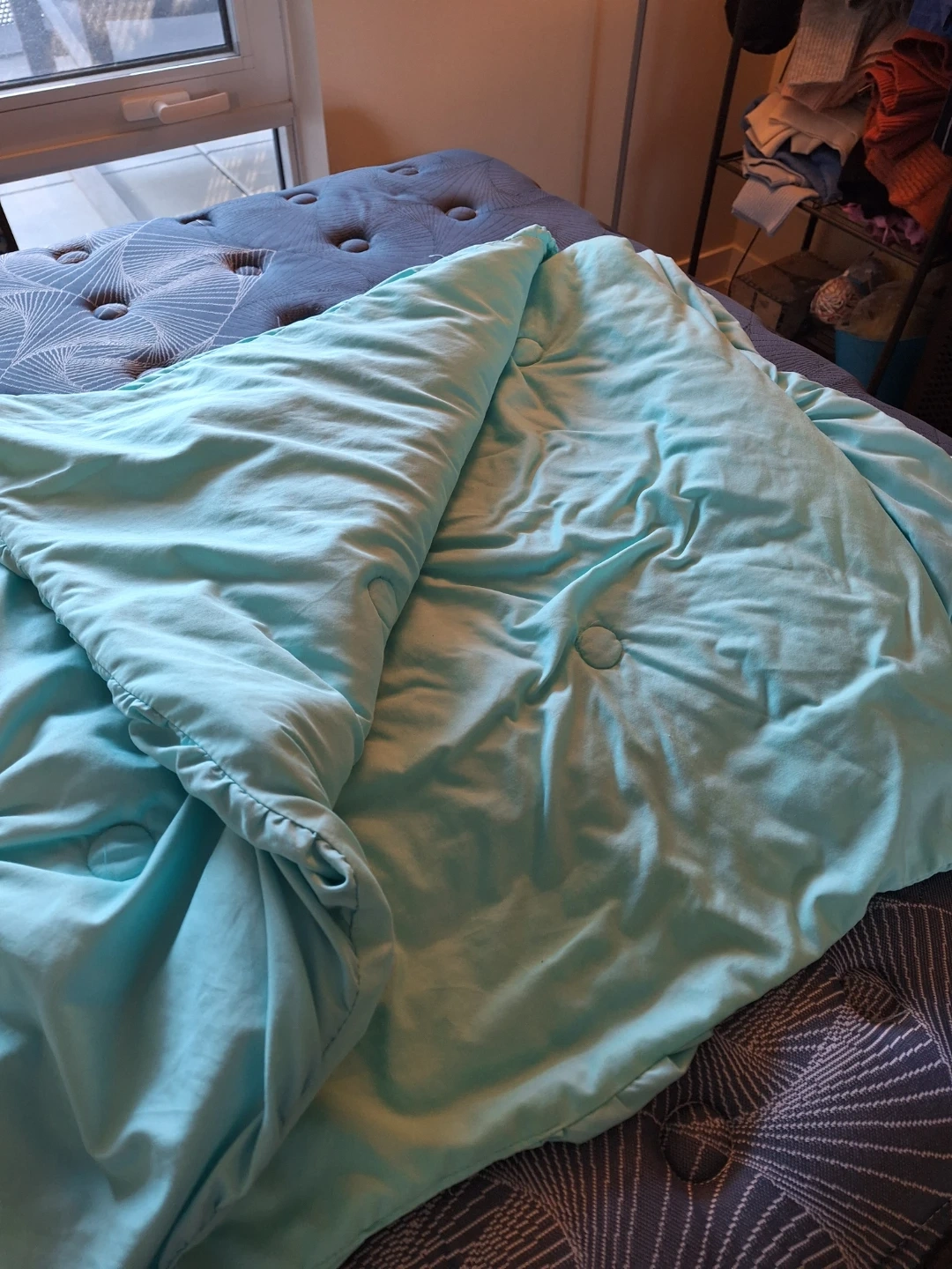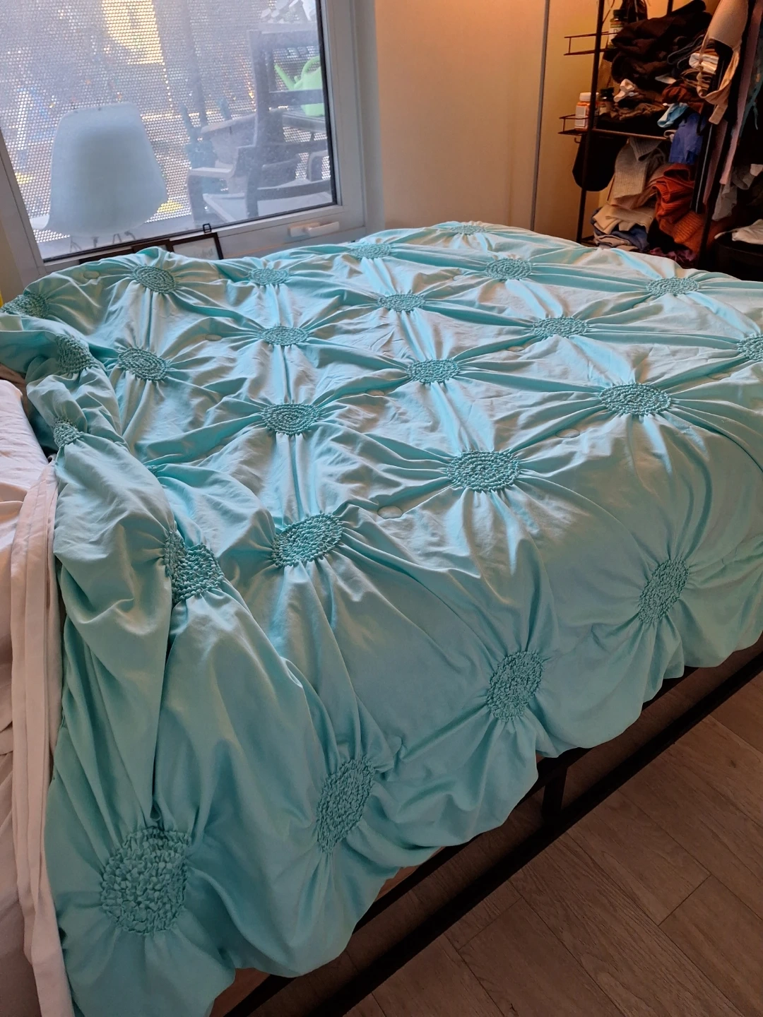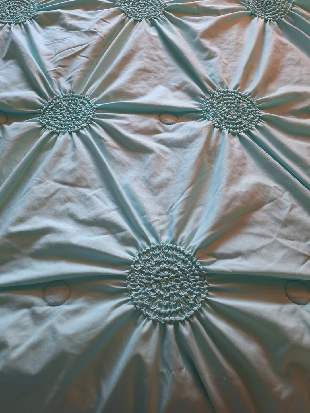 This aqua comforter features a lovely tufted design with circular patterns. It's made of a soft, smooth material that gives it a nice sheen. Adds a pop of colour to any bedroom!