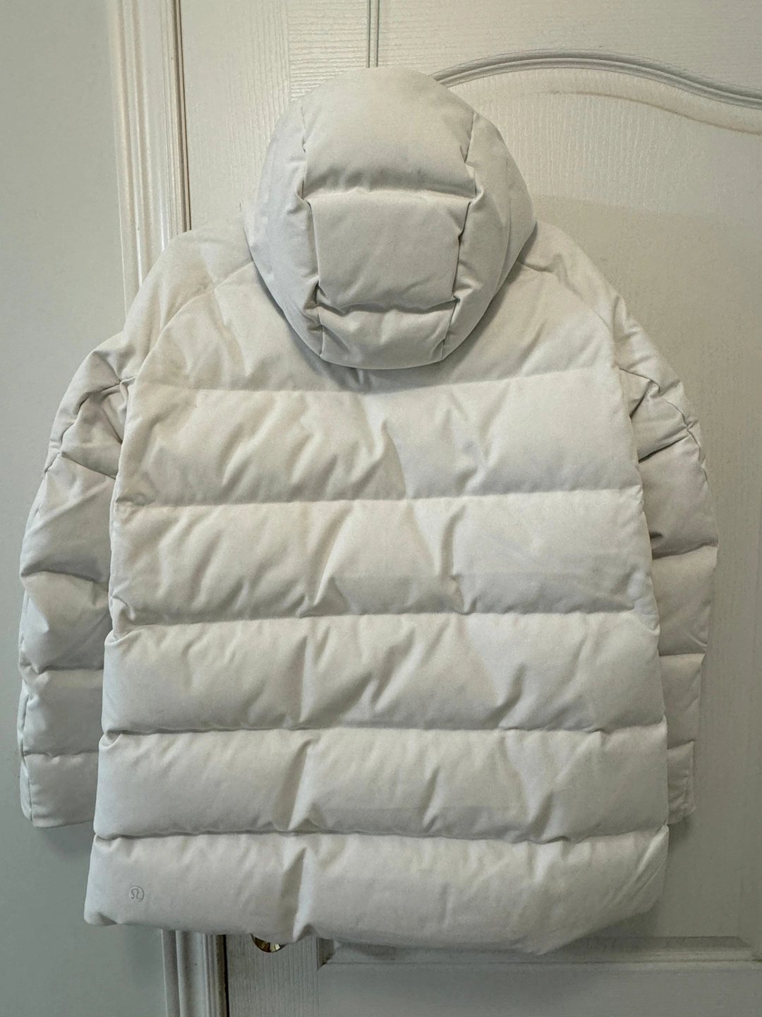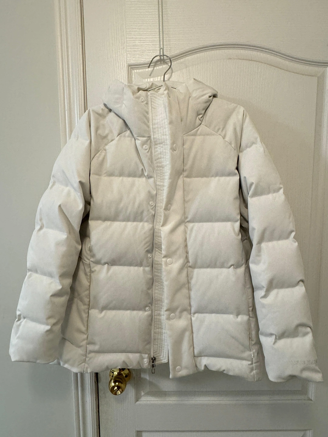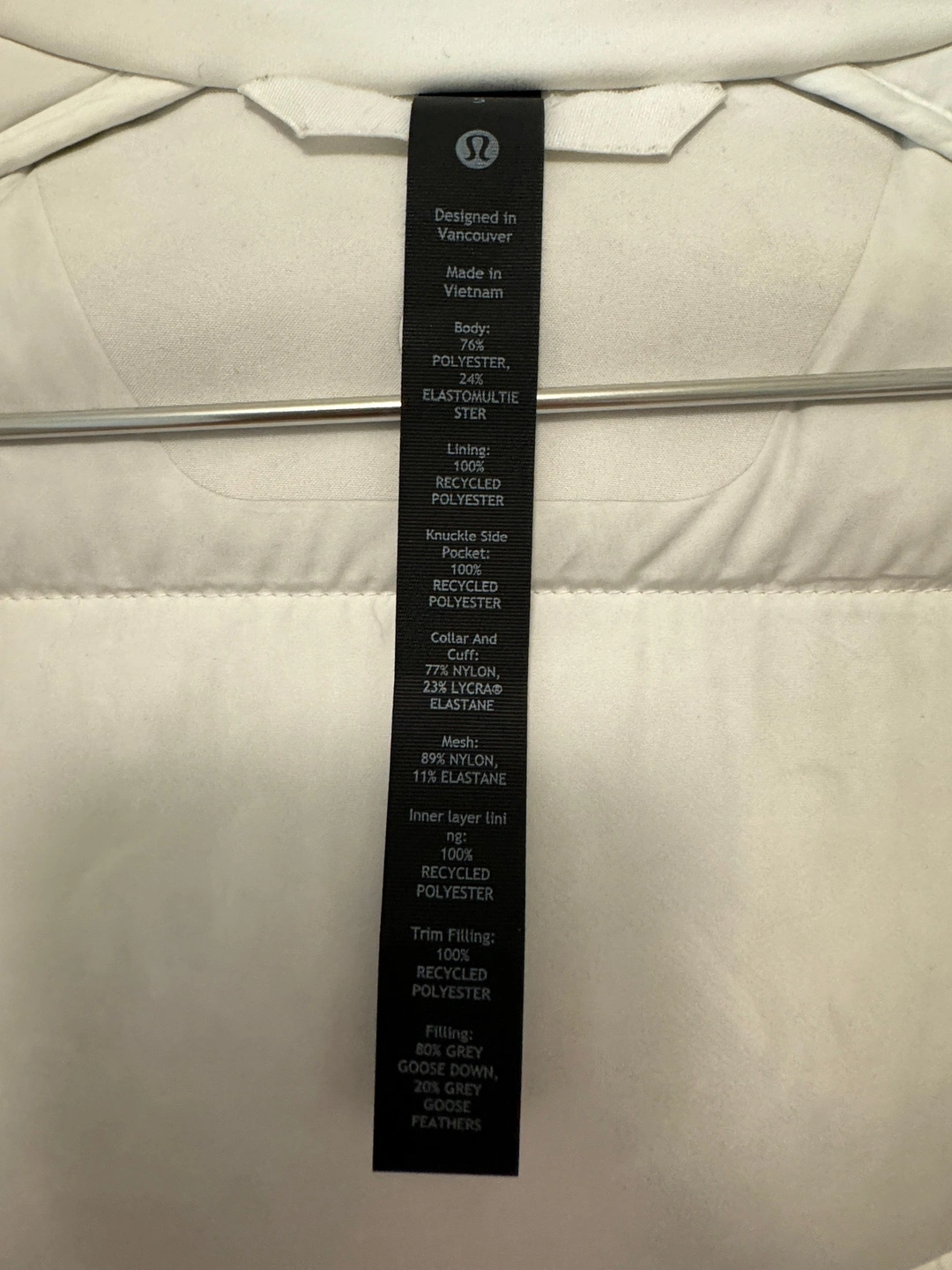 White down jacket with hood. Zipper and button closure. Size S. Tag shows the jacket is made in Vietnam. Lululemon logo on the left sleeve. Jacket is designed in Vancouver.