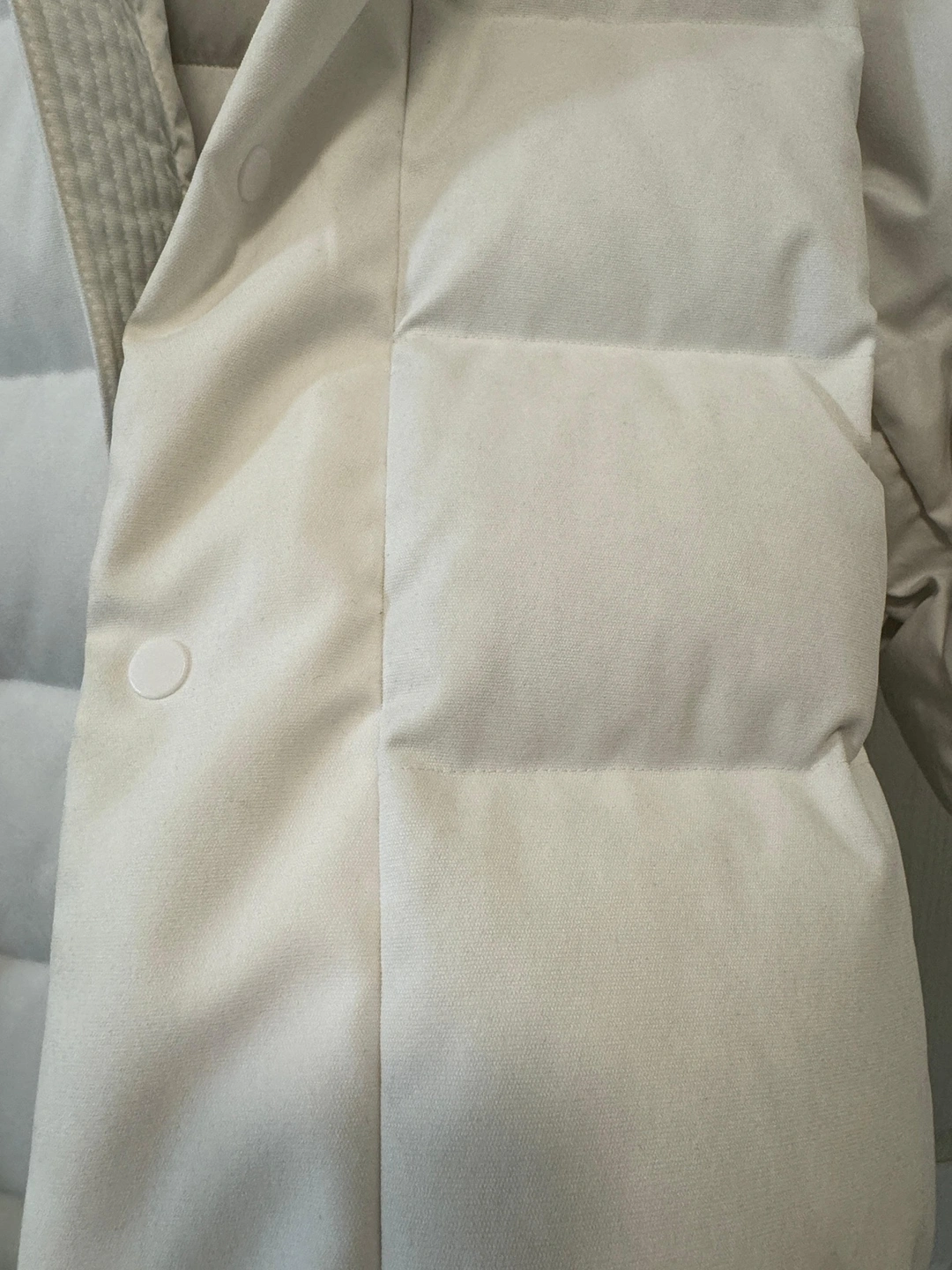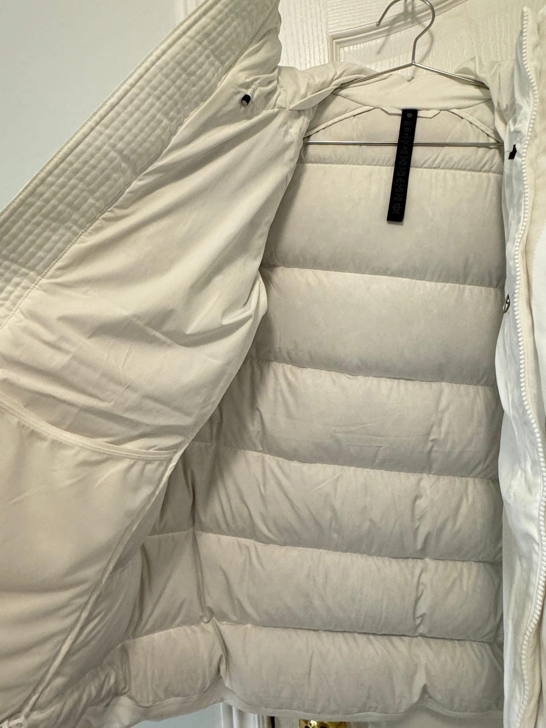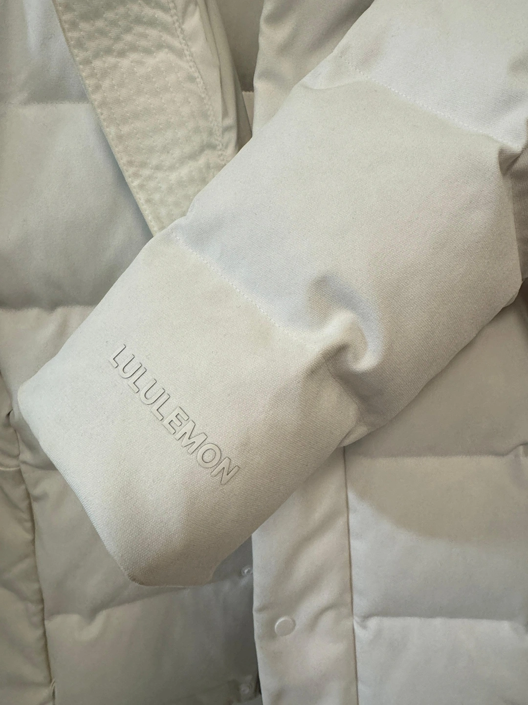 White down jacket with hood. Zipper and button closure. Size S. Tag shows the jacket is made in Vietnam. Lululemon logo on the left sleeve. Jacket is designed in Vancouver.