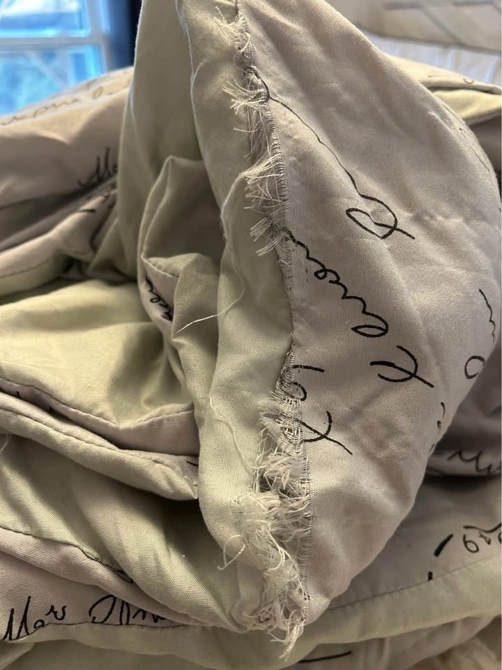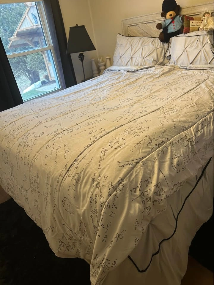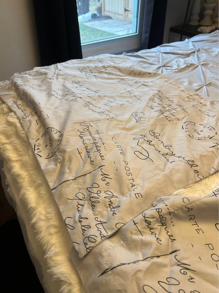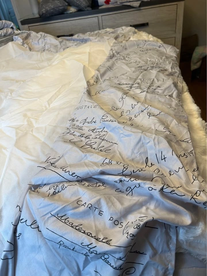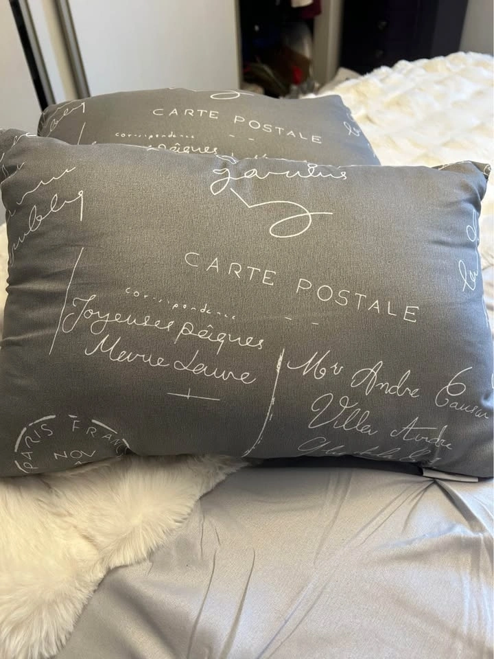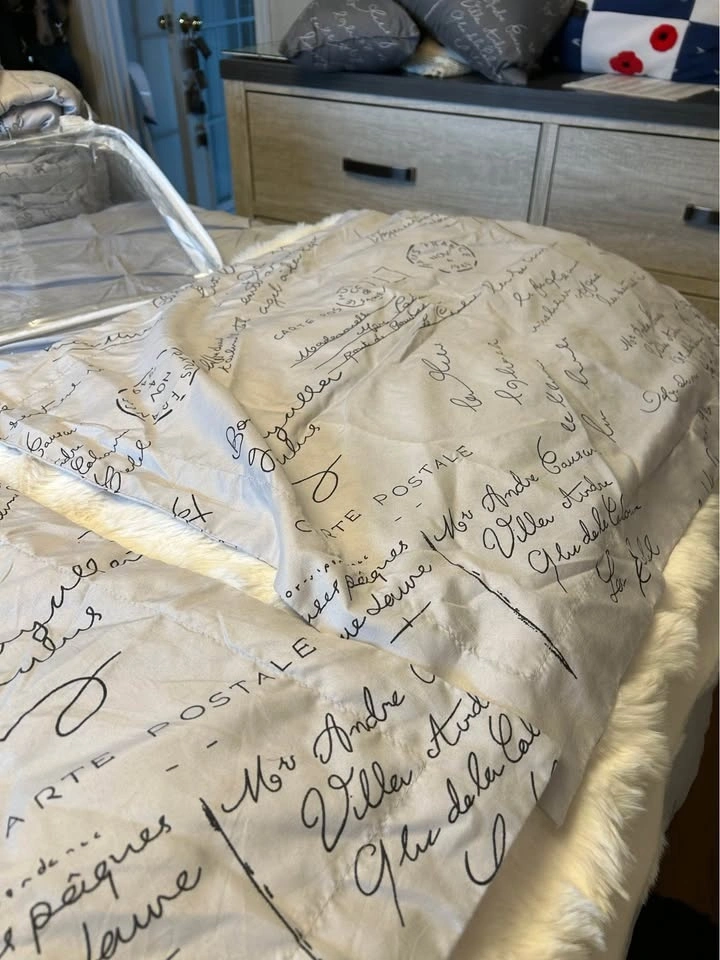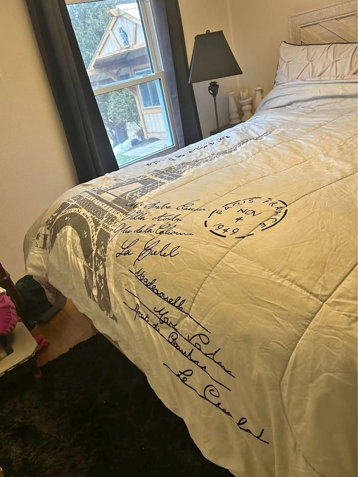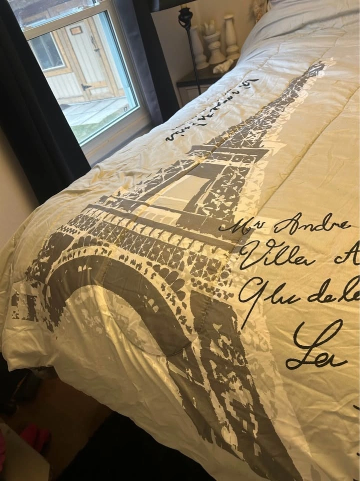 This Paris-themed comforter set includes two pillow shams, one bed skirt, and two pillows. It's in good shape, with a small rip on the seam that's easy to mend. You can use either side of the comforter. Pick up in Dorchester, Ontario.