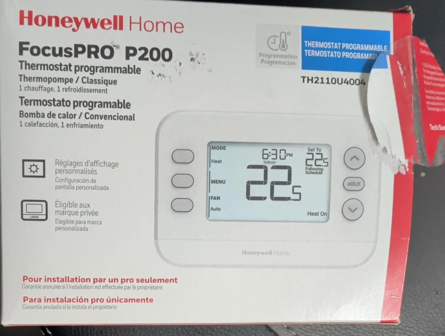 Honeywell Home FocusPRO P200 programmable thermostat. Supports 1 stage heating and 1 stage cooling. Includes customizable display settings. For professional installation only.