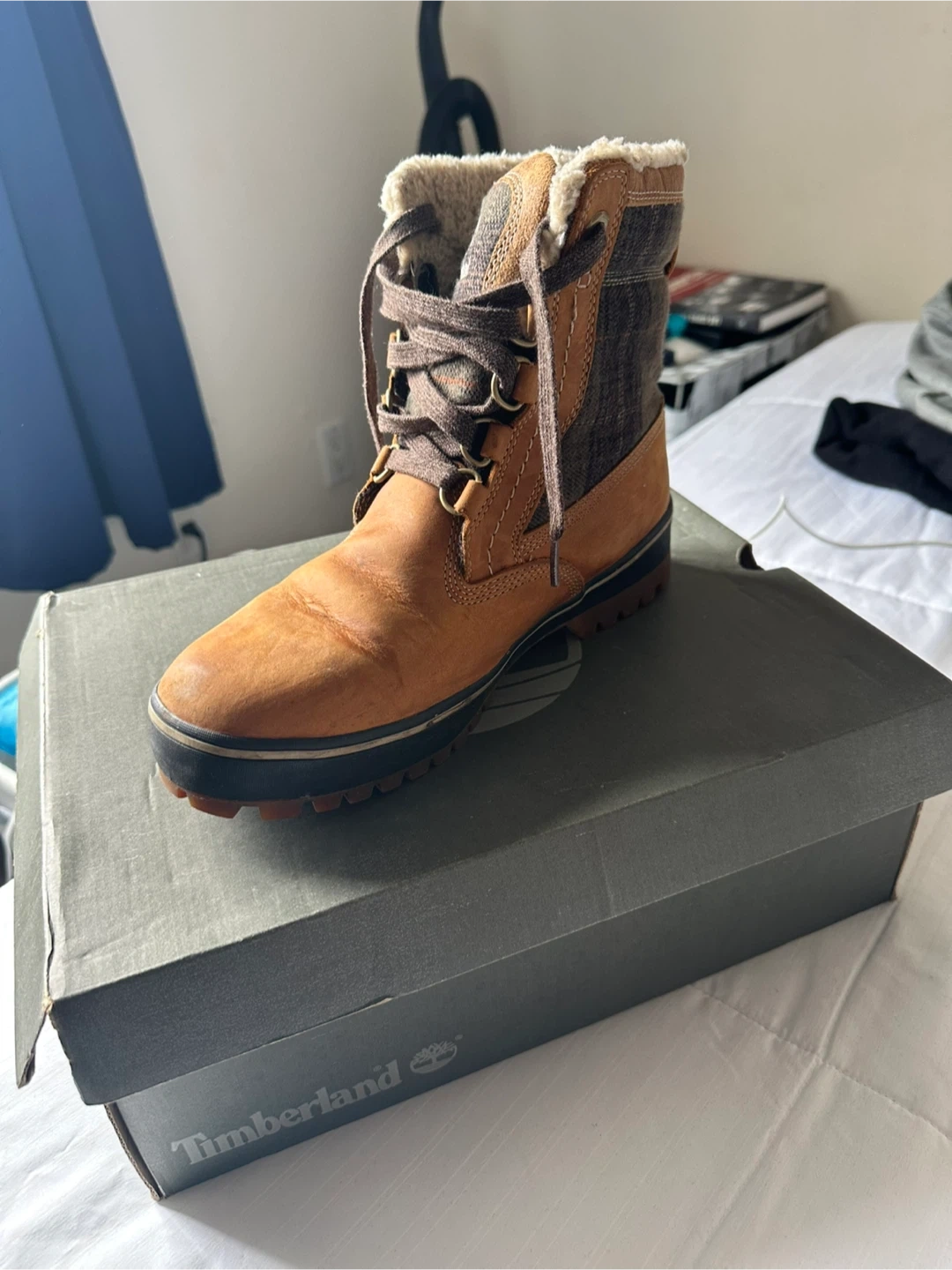 Timberland men's brown winter boots. Includes original box. These boots are lined with a warm shearling material. US size 7.