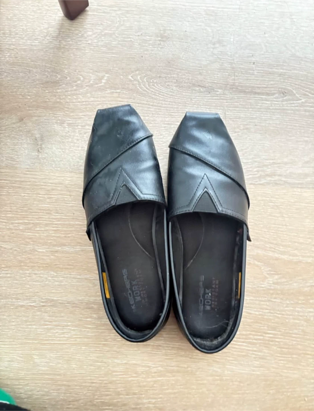 These Skechers Work slip-on shoes are black and made for comfort. They have a memory foam insole for added support. Perfect for a long day on your feet! Slip resistant. Only worn twice