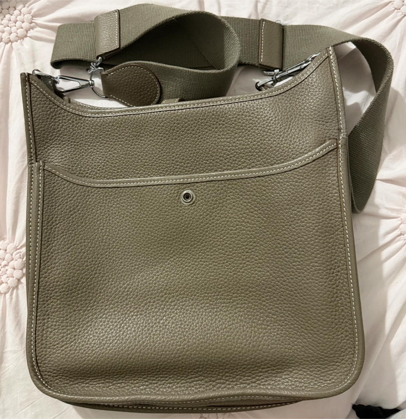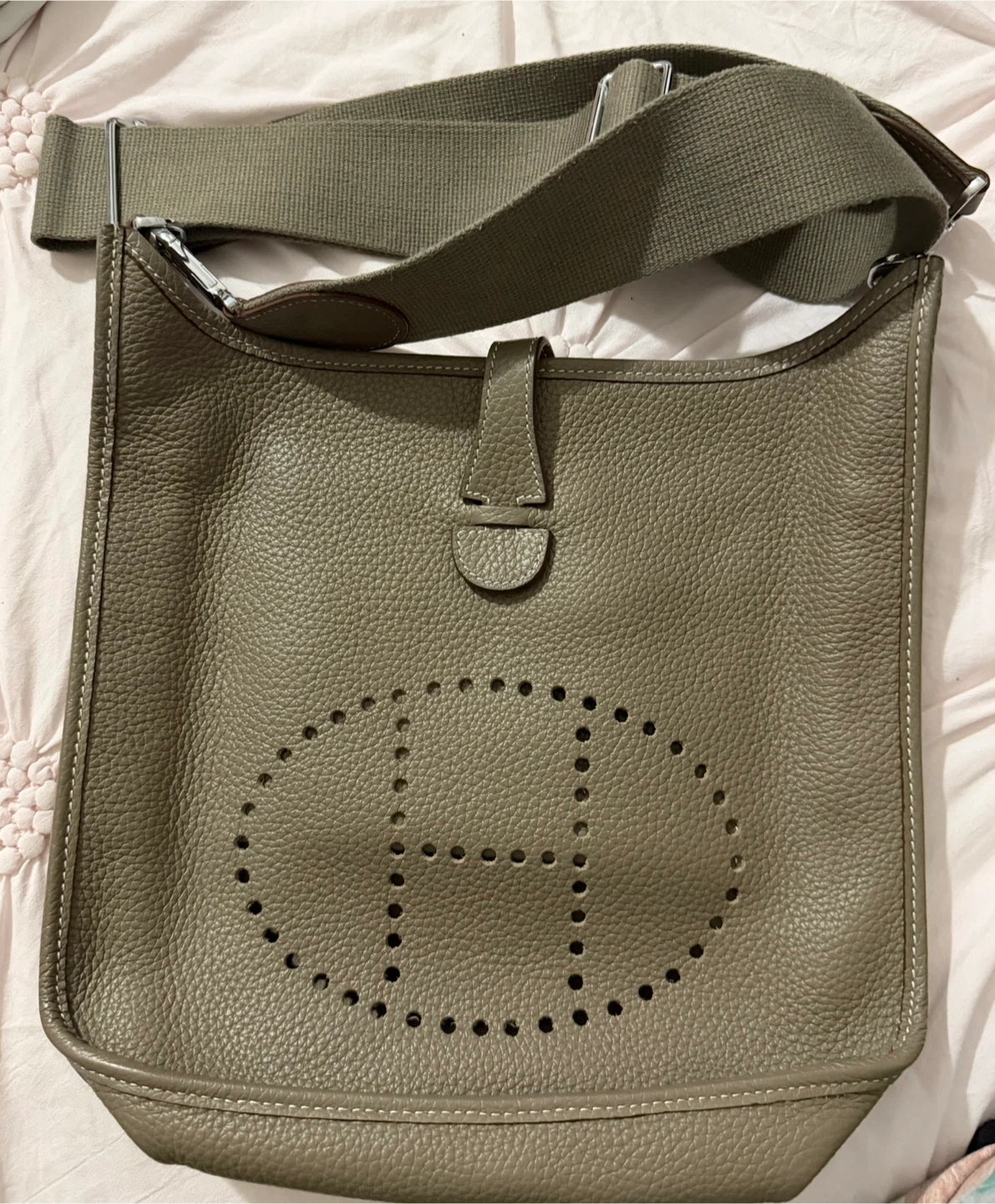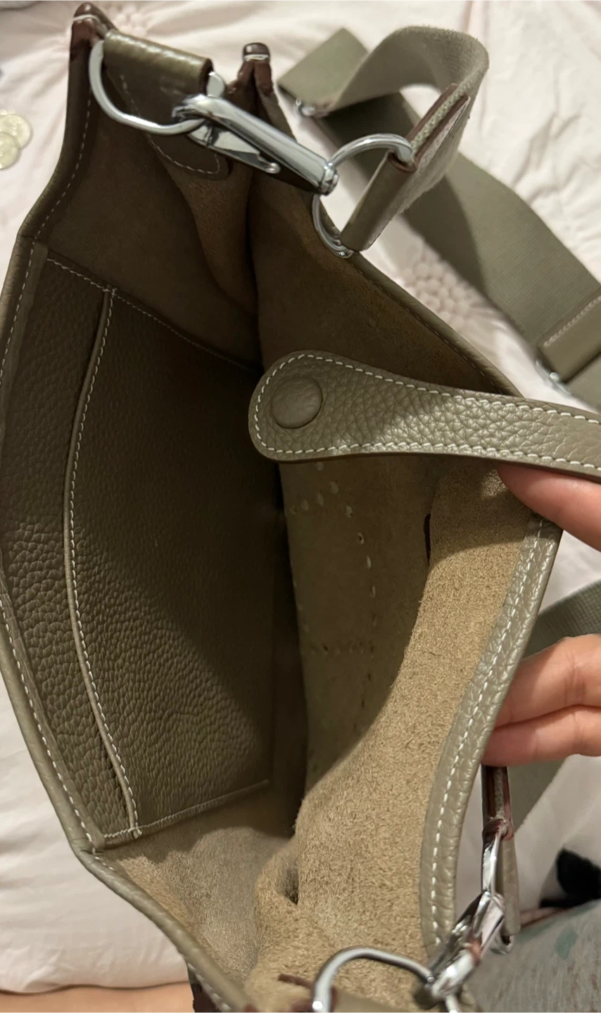 This is a taupe leather Hermes Evelyne TPM shoulder bag. It's an authentic piece with the signature 'H' perforation detail. It's suitable for daily use and can be worn cross-body or on the shoulder.