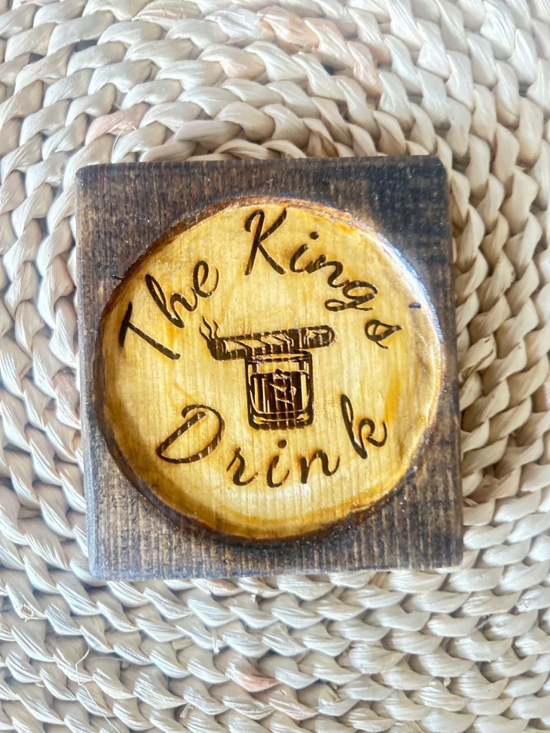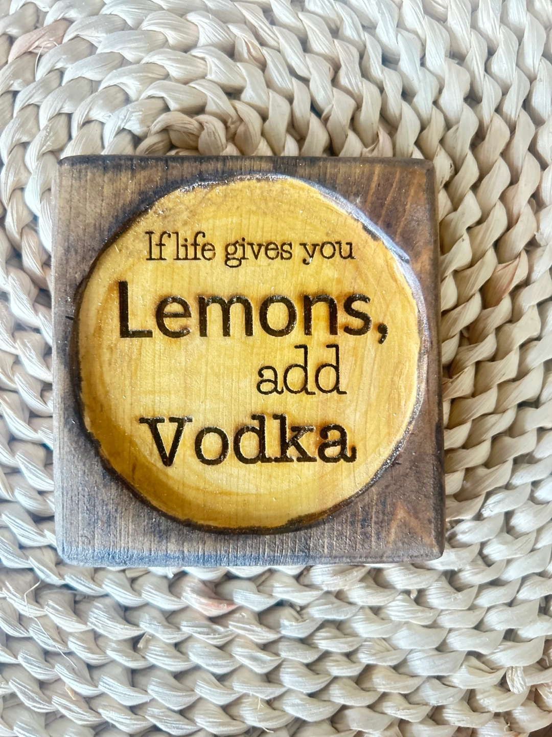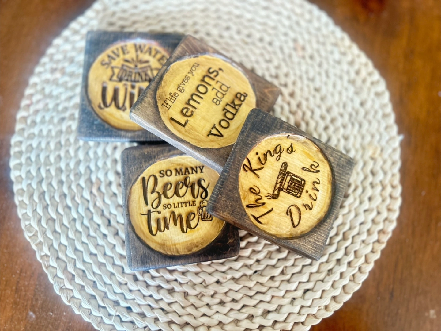 I'm selling a set of four coasters with funny drink-related sayings. These are perfect for adding a bit of humour to your home decor! They are made of wood and have a rustic look.