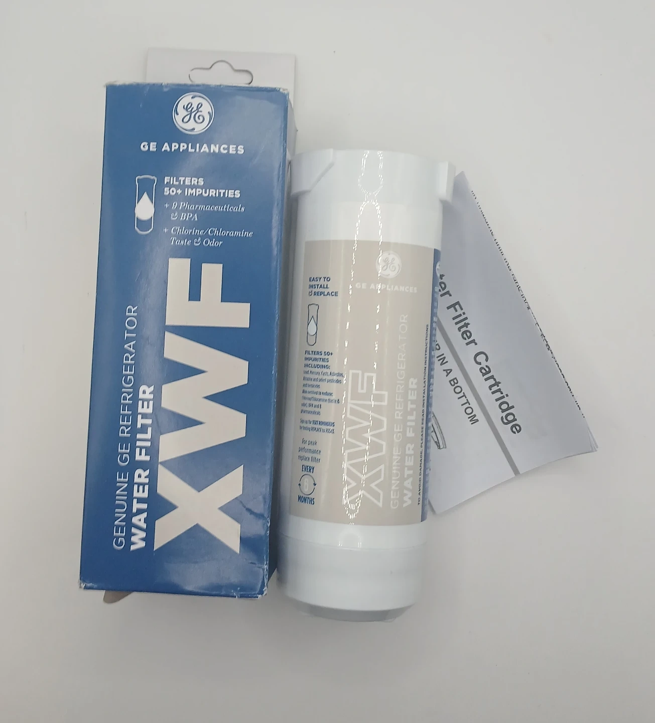 Genuine GE refrigerator water filter, model XWF. Filters 50+ impurities including pharmaceuticals, BPA, and chlorine/chloramine taste and odor. Easy to own and replace. Filters 6 months.