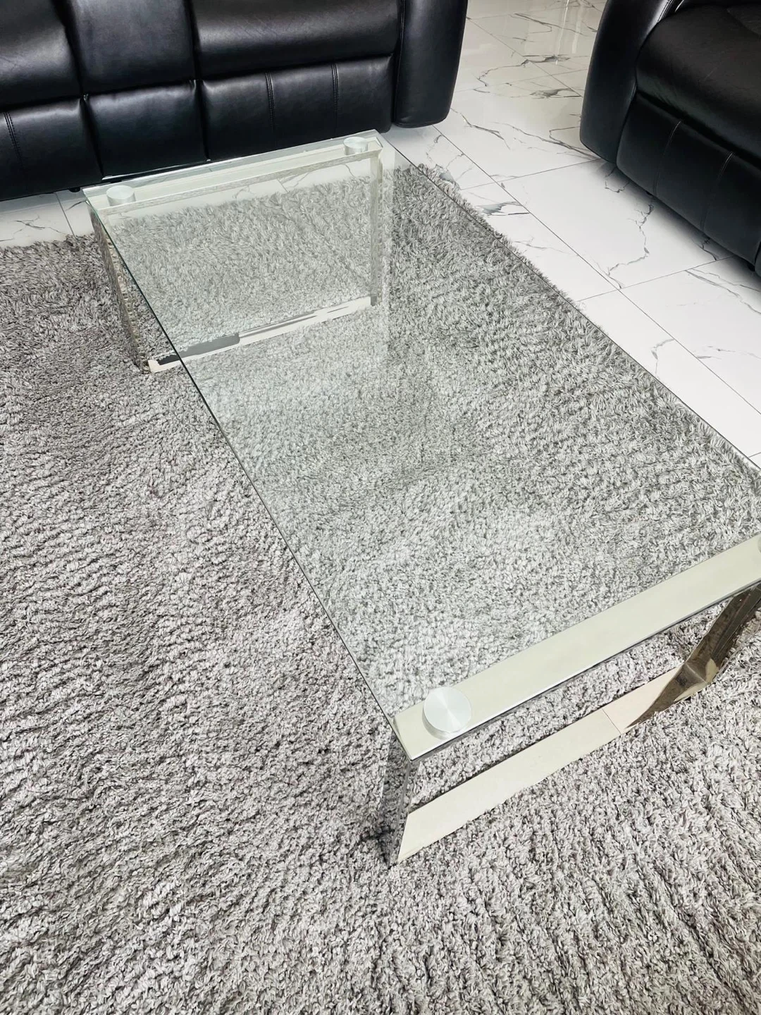 Modern glass coffee table with a sleek chrome frame. It's approximately 47 inches long and 20 inches wide. The glass top has a minimalist design, perfect for contemporary living spaces. Bought from the Brick two weeks ago. Asked $155.