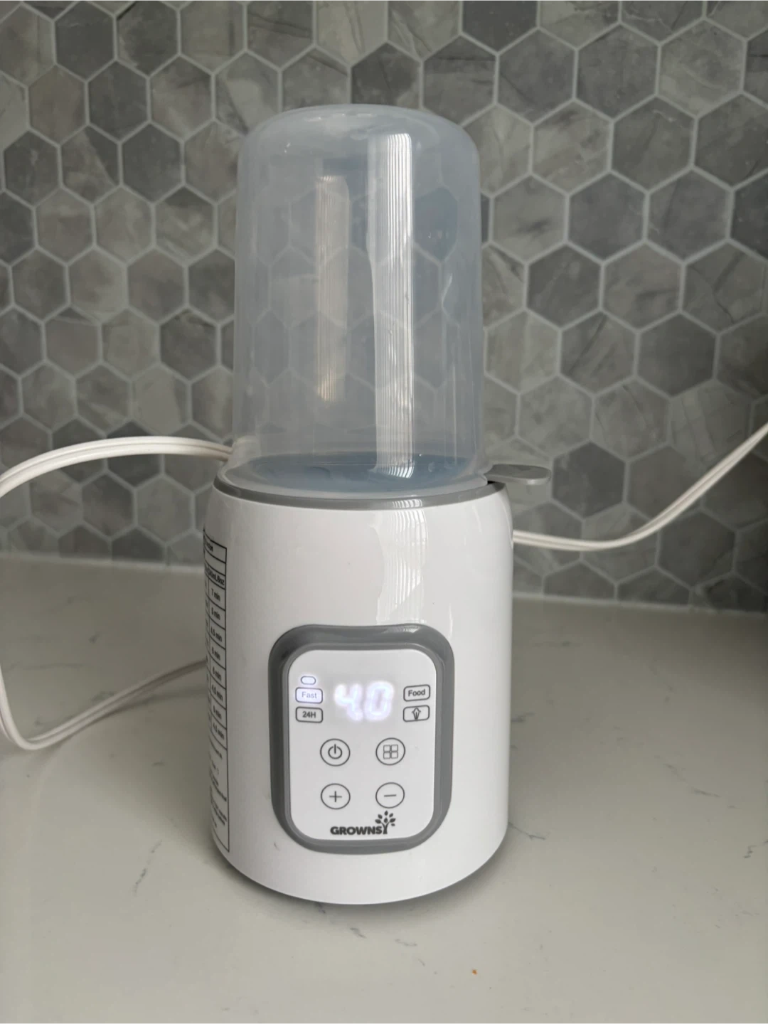 This GROWNISt bottle warmer gently heats baby bottles. It features a digital display for precise temperature control. A great appliance for busy parents on the go!