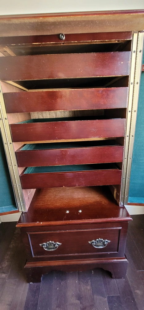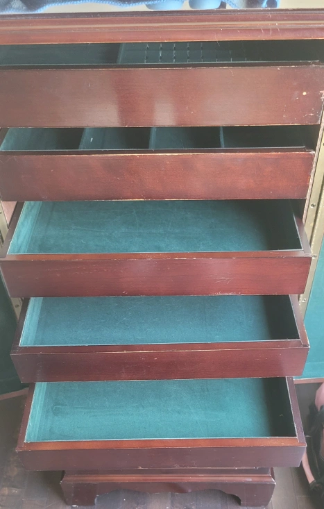 This beautiful jewelry box chest is a rare find. It’s been loved and enjoyed with some chips and scratches but is in great overall condition. The drawers are lined with green velvet. 22” x 13.5” x 8”.