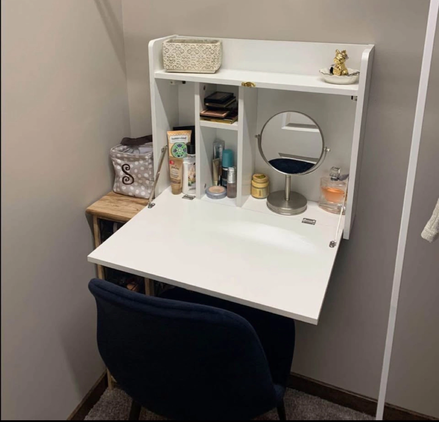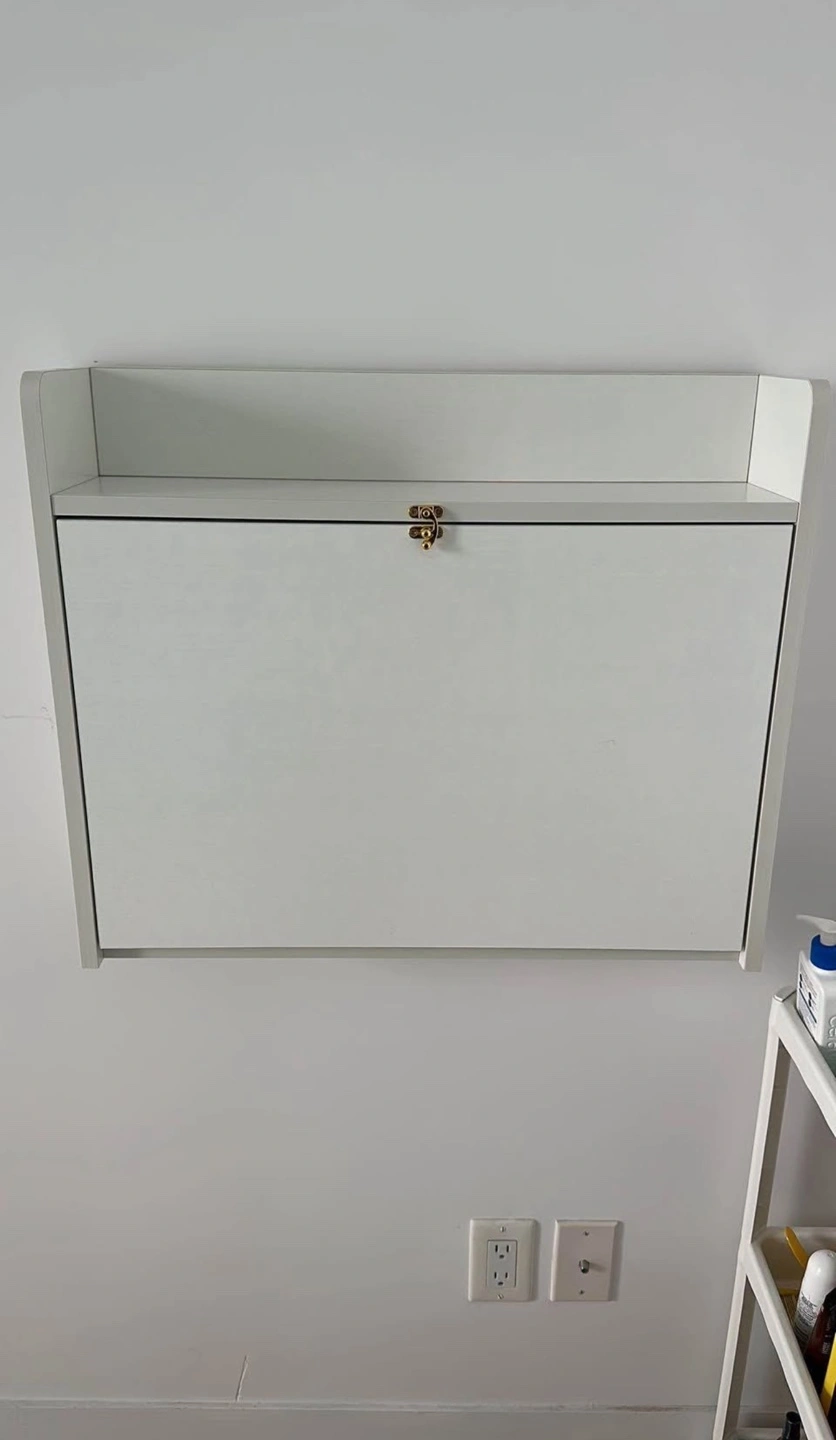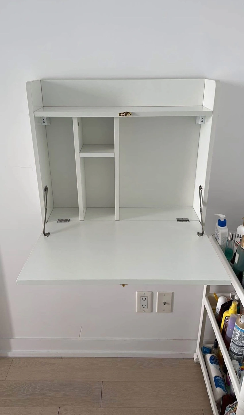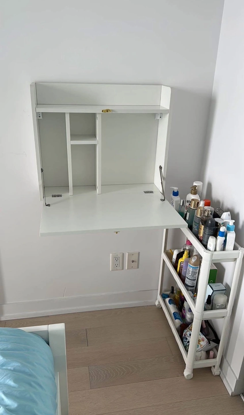 It’s a wall-mounted foldable vanity/desk. It is a great piece for small places. I bought it a few months ago, however, I will be moving out soon and I can’t take it with me. I basically didn’t use it that much, was just keeping my makeup.