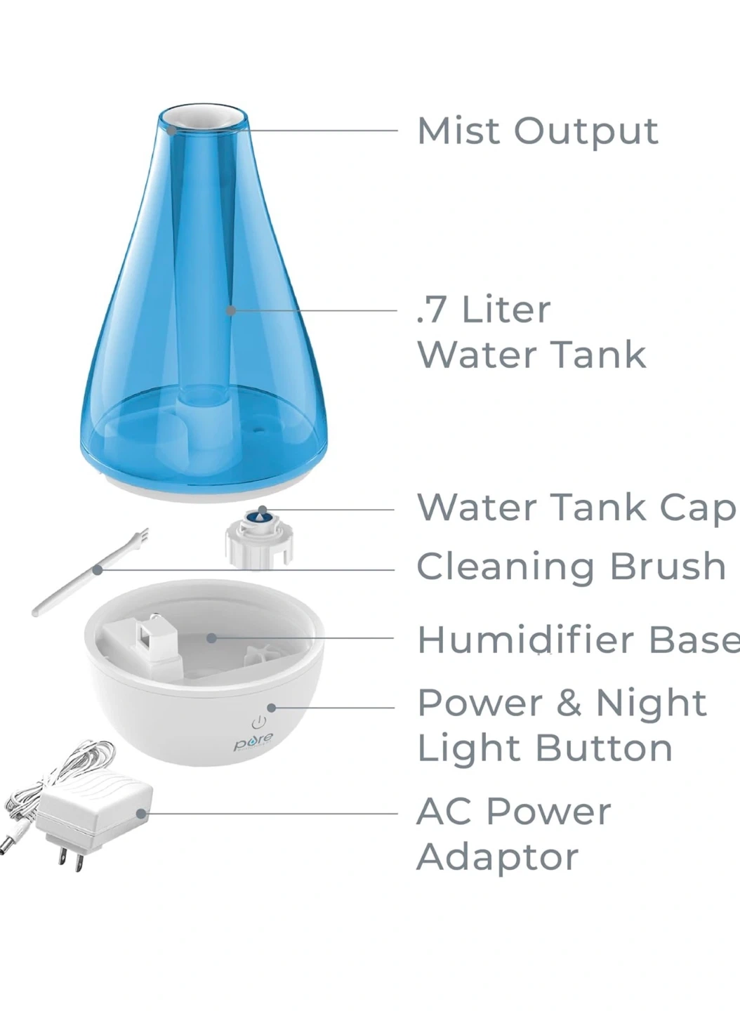 This ultrasonic humidifier adds moisture to the air for easier breathing. It has a .7 liter water tank and a mist output. Includes the humidifier base, water tank cap, cleaning brush, and AC power adapter. Measures 5 inches wide and 9 inches tall.