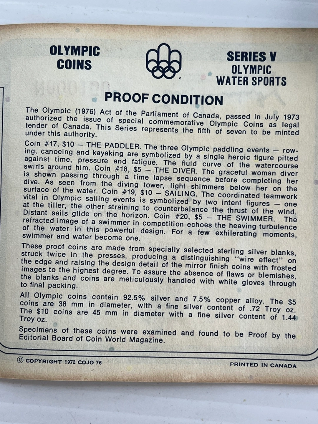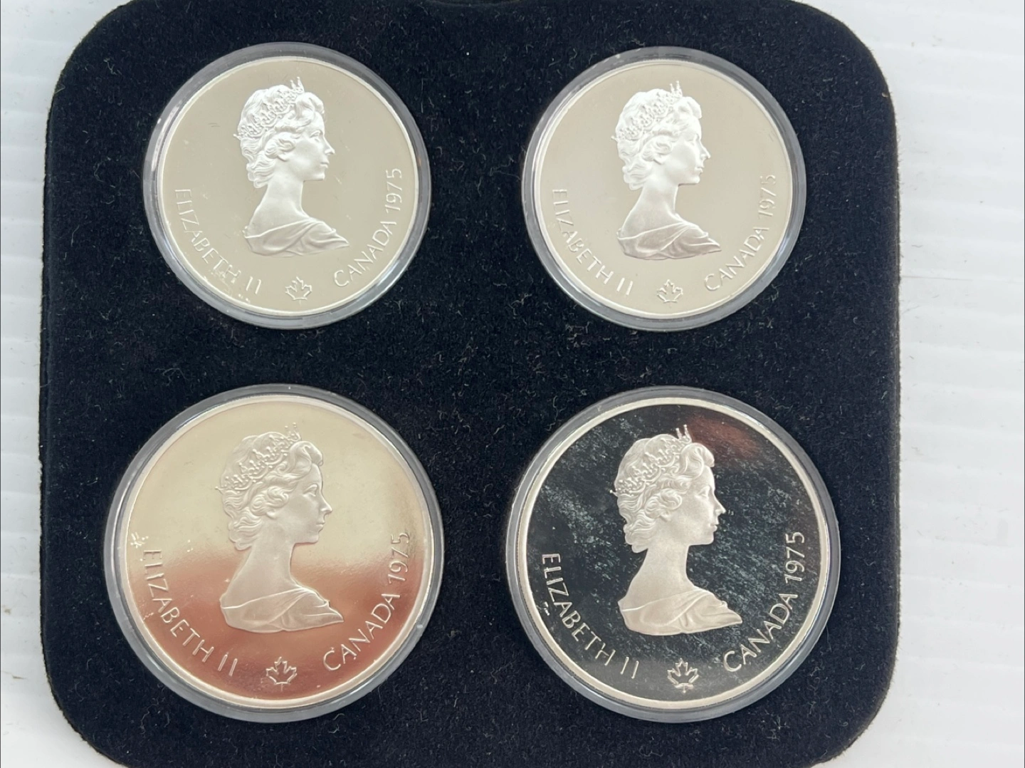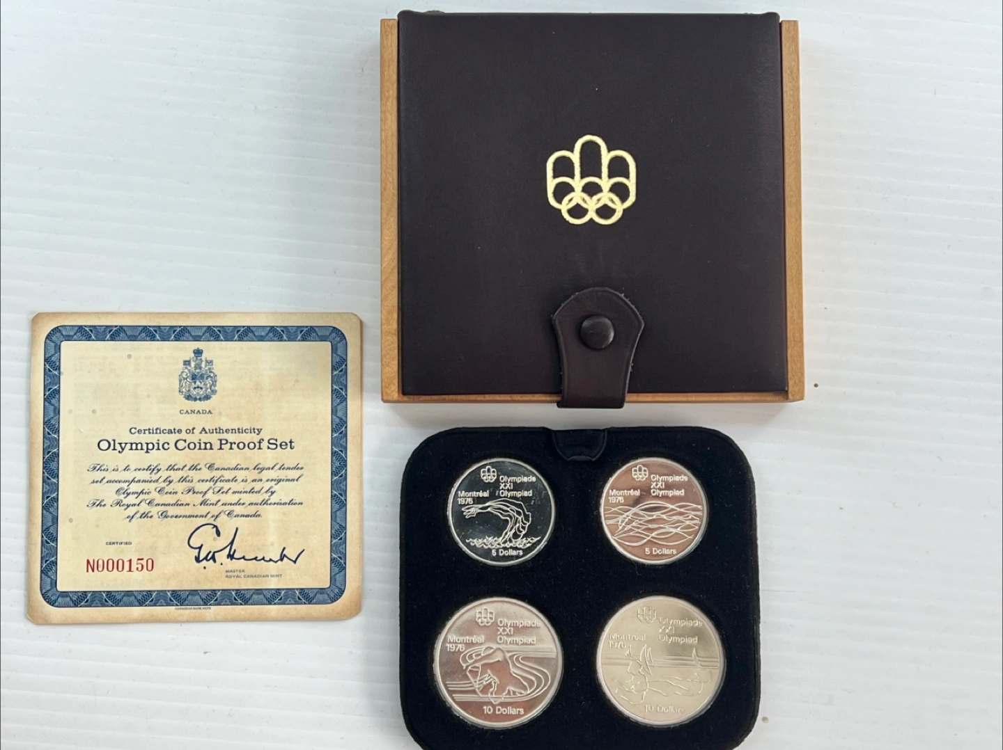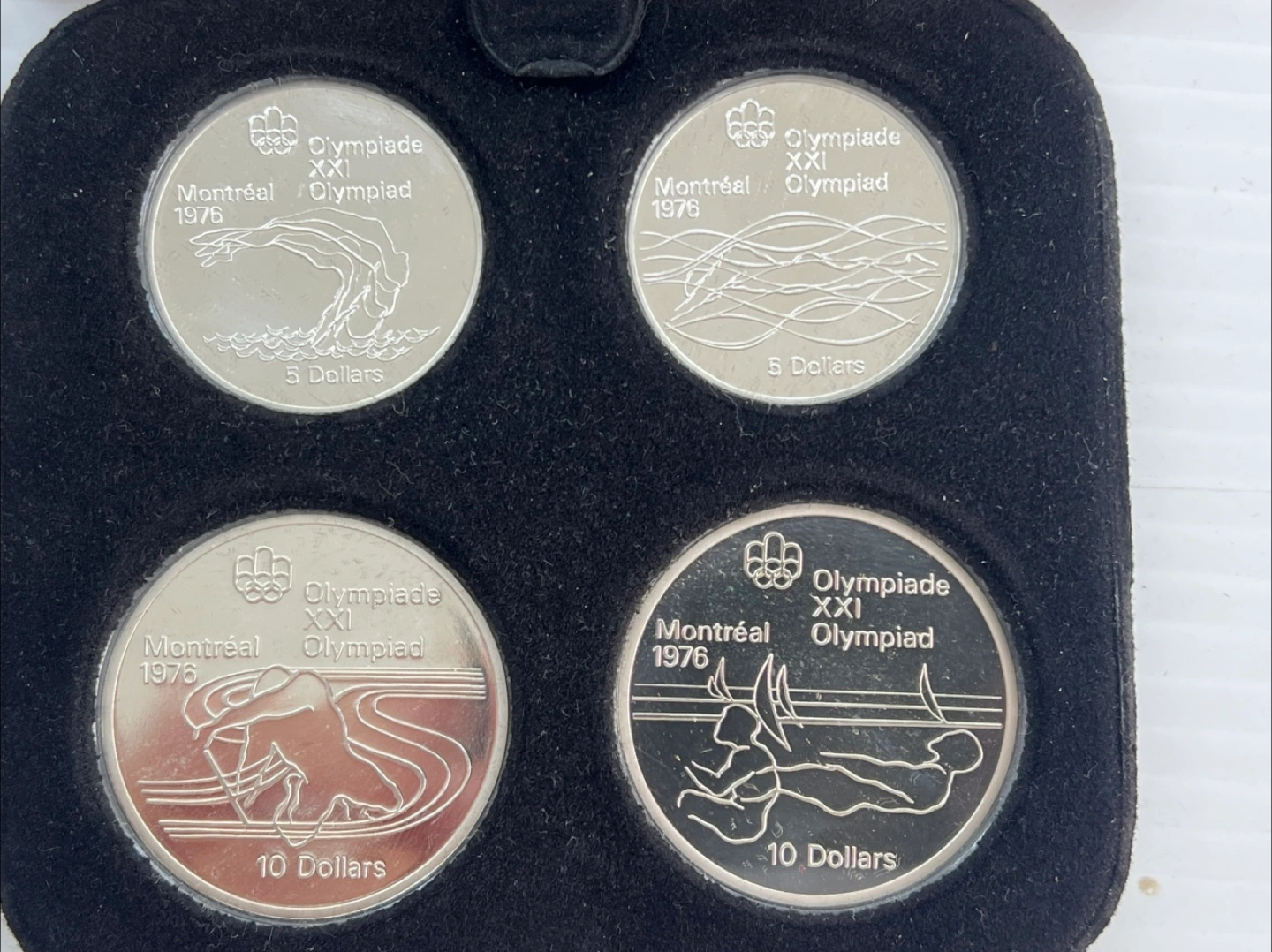 This is the 1976 Montreal Olympic Proof Coin Set from Canada. It includes four coins: two 5 Dollar coins and two 10 Dollar coins. These coins were made from specially selected sterling silver with a fine silver content of 72 Troy oz. The coins are 38 mm in diameter. Mint condition , boxed as shown .