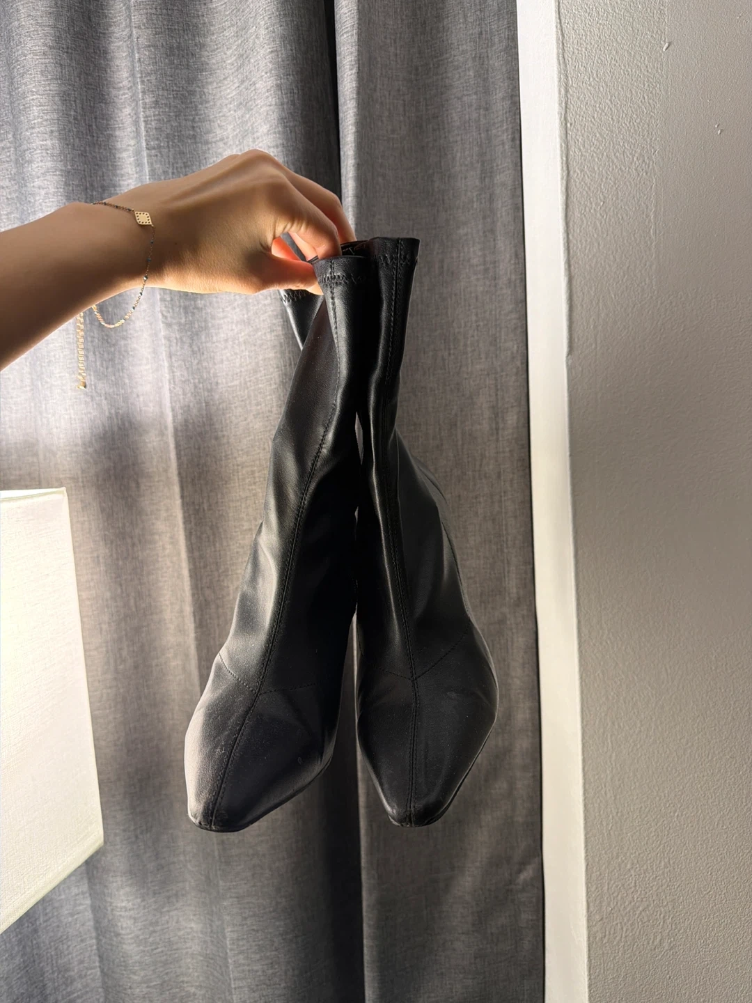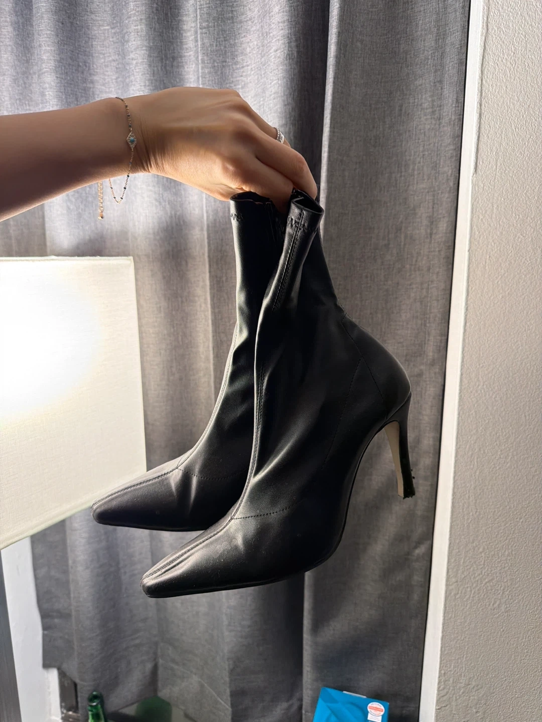 These are black sock boots with a pointed toe and stiletto heel. They're made of a flexible material that hugs the ankle. Heel height is approximately 3.5 inches