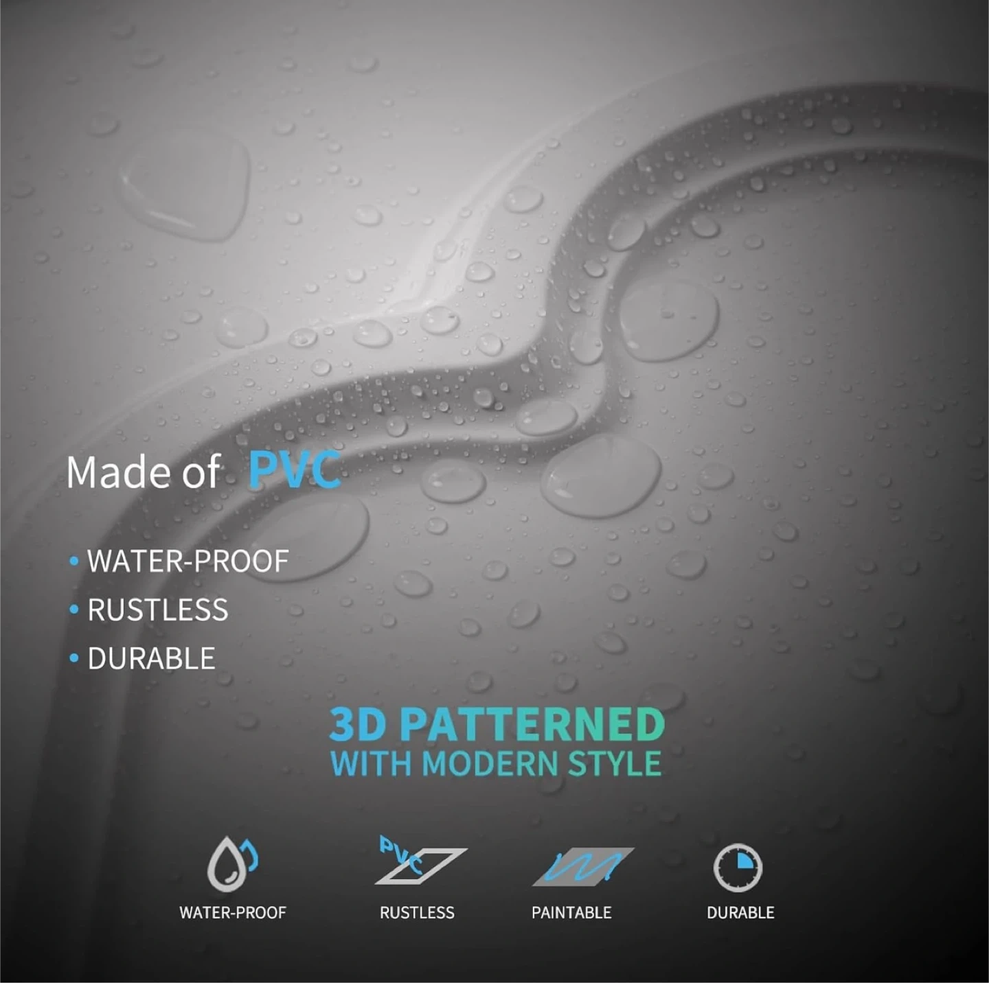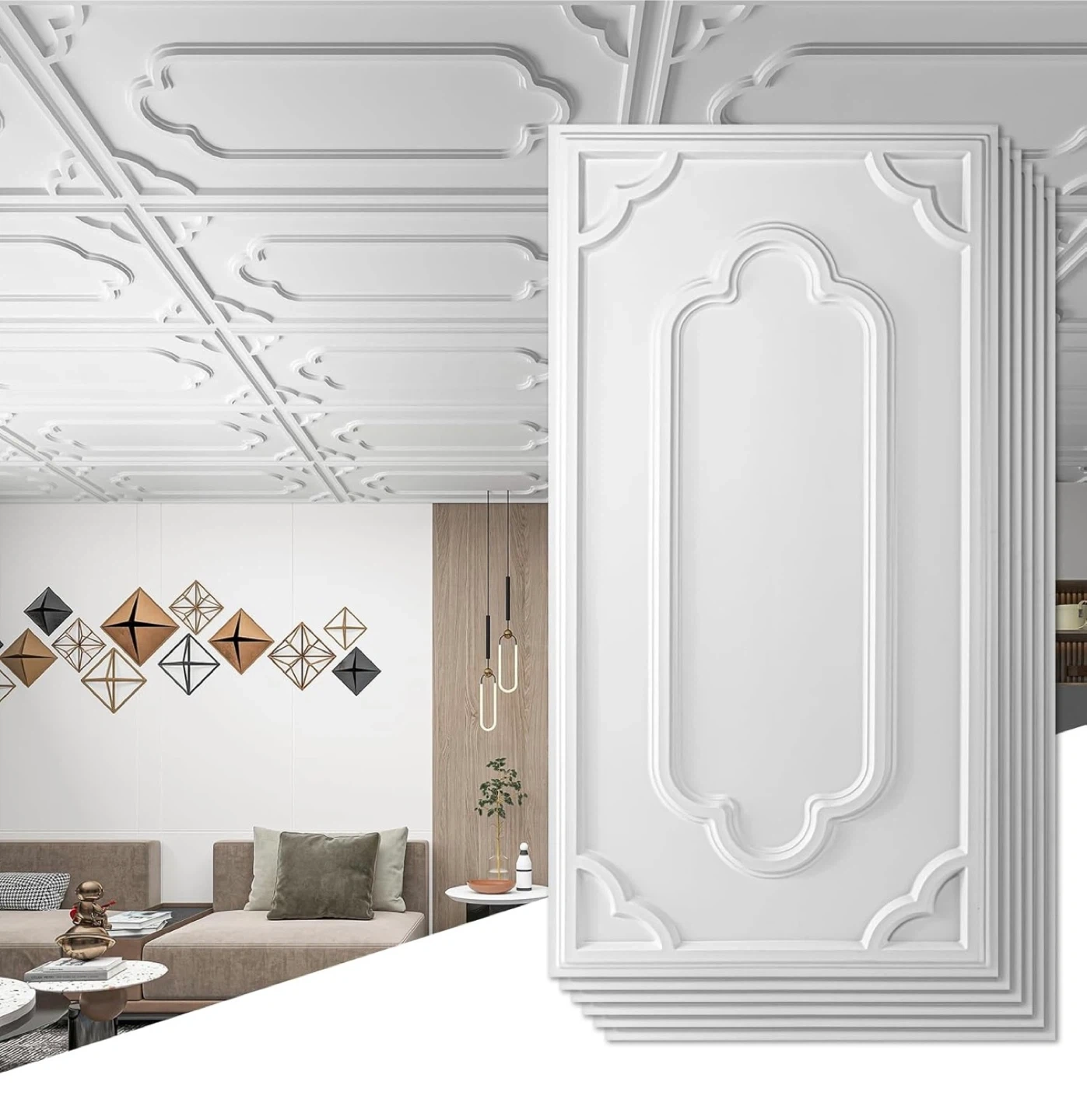 S These white PVC decorative ceiling tiles feature a 3D patterned modern style. They're water-proof, rustless, and durable. Tiles are 24" x 48" with a 0.5" height. They can be used on walls or ceilings!
