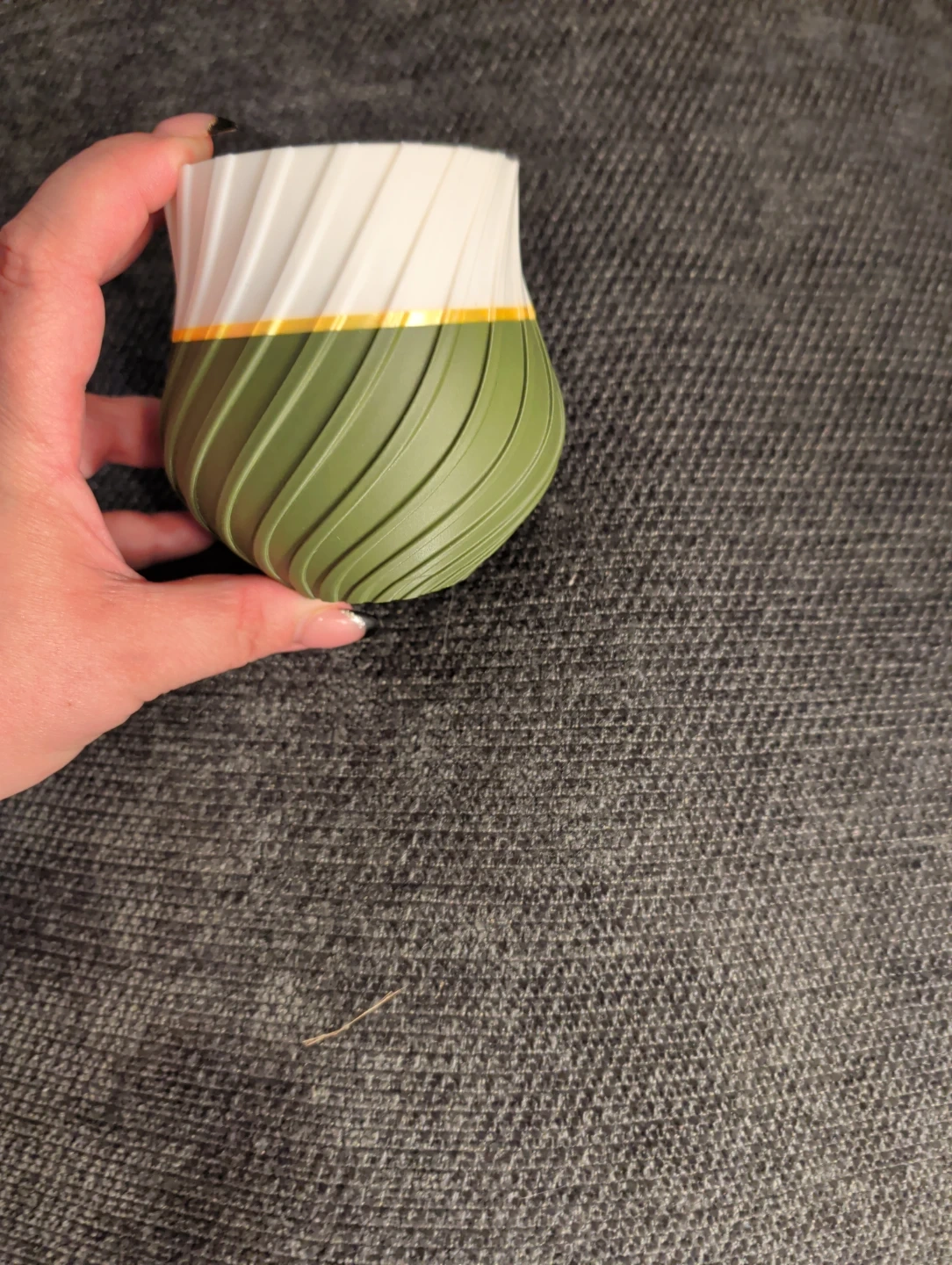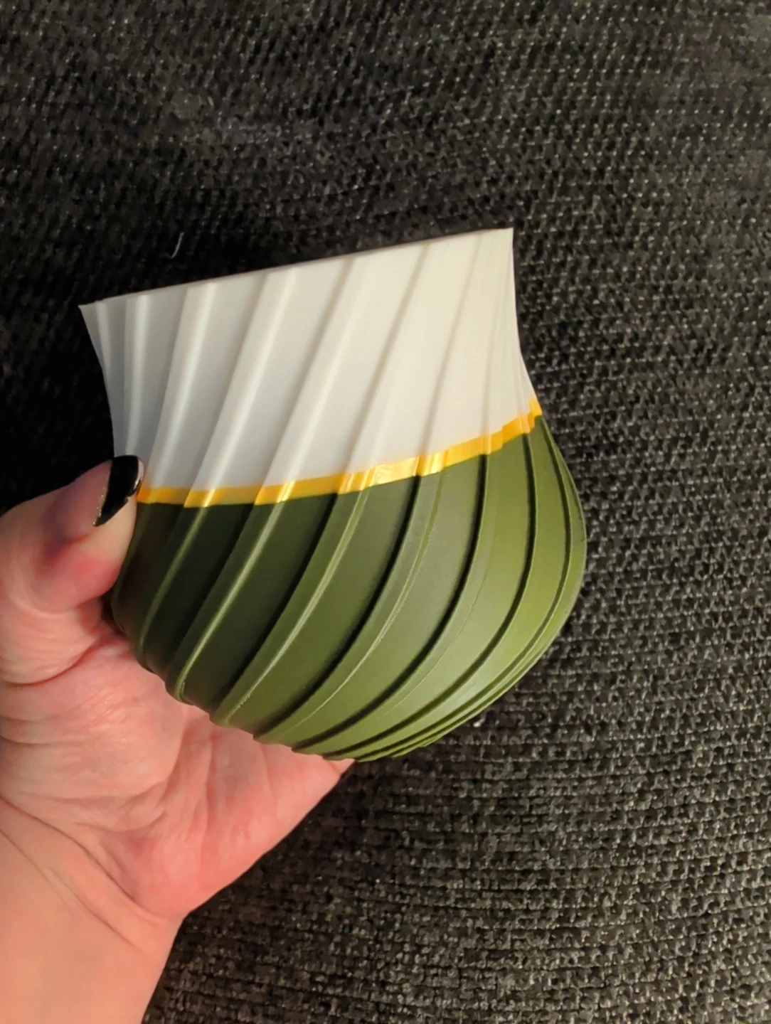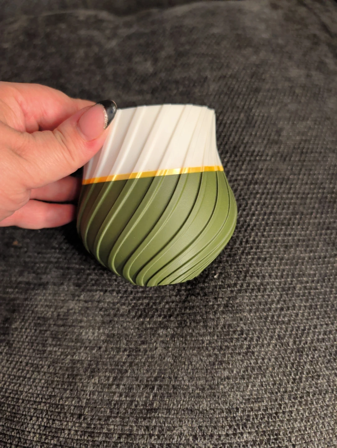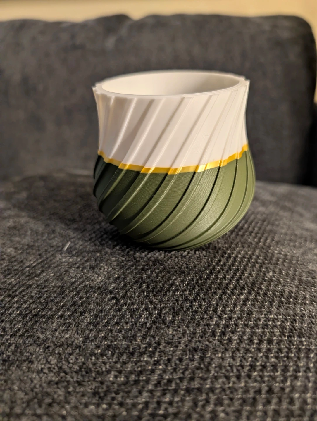 3D printe Twisted Decorative Planter – Olive Green, White & Gold