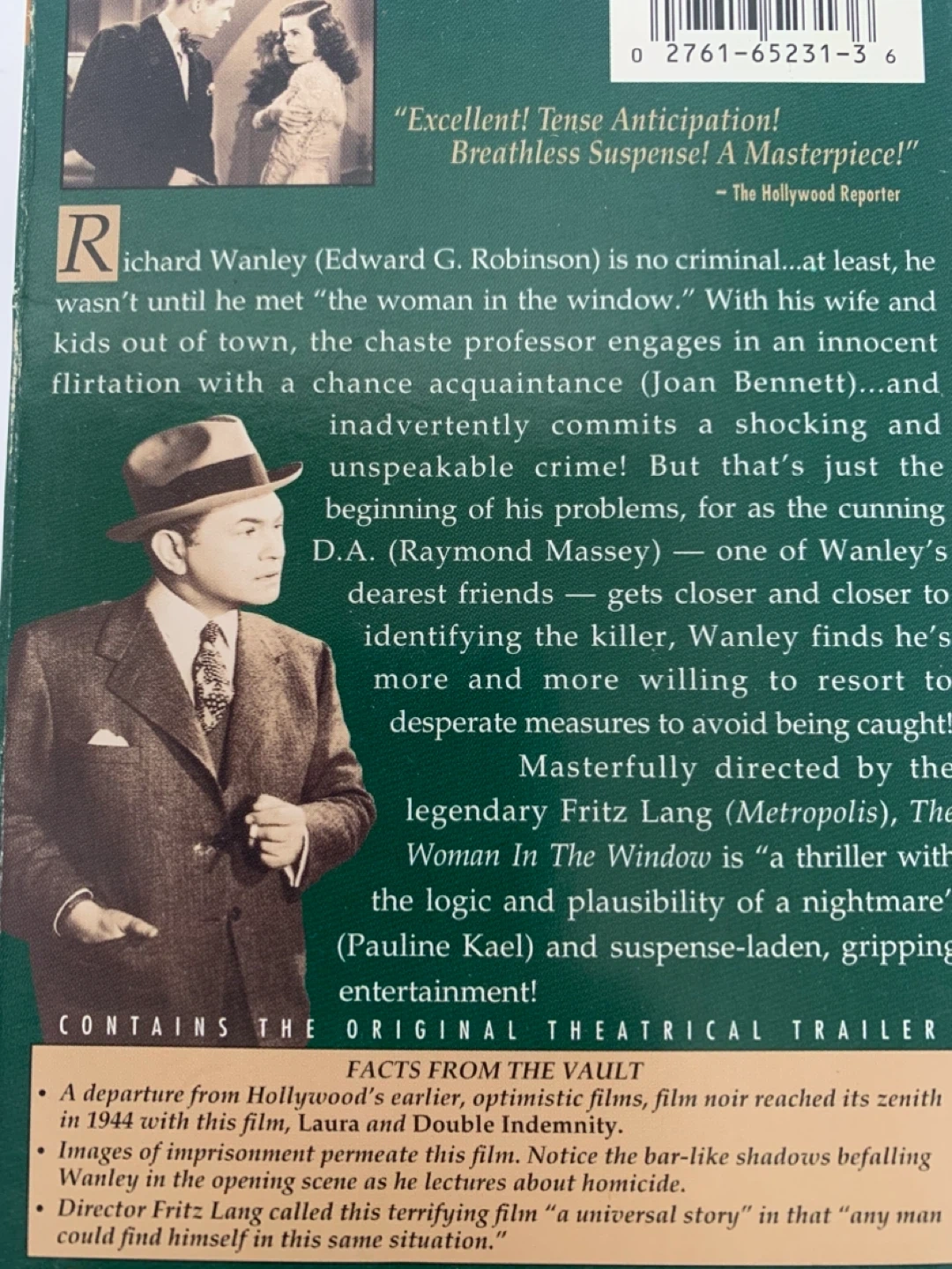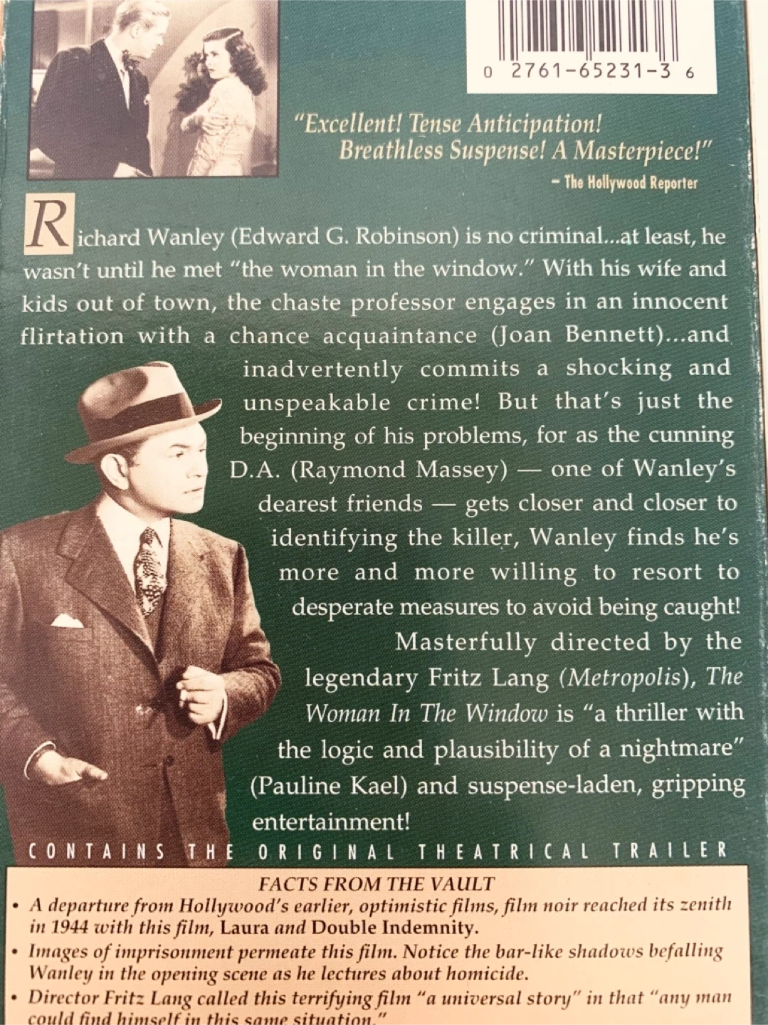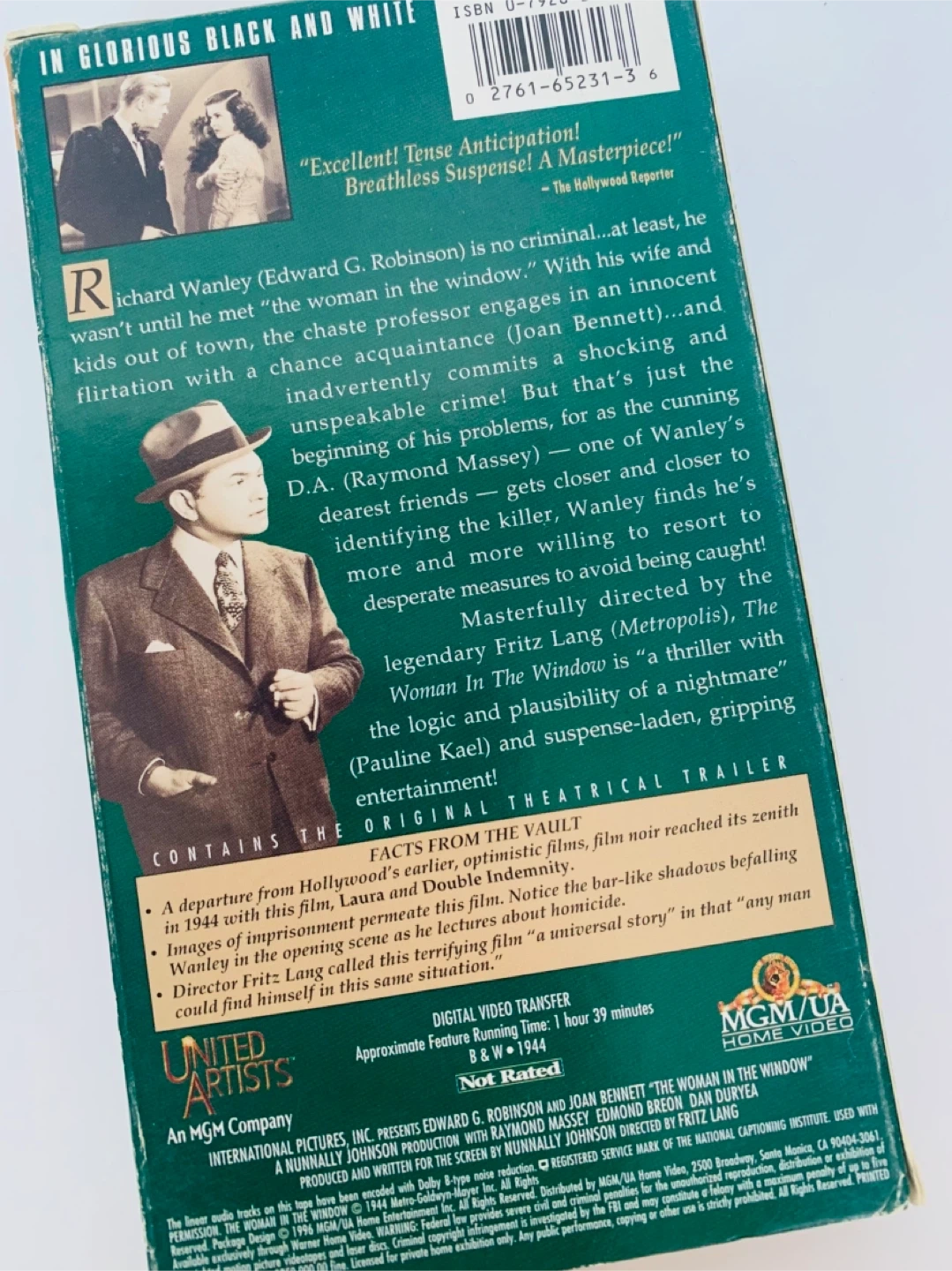 This is the classic film "The Woman in the Window" starring Edward G. Robinson and Joan Bennett. It's a thrilling film noir directed by Fritz Lang. The VHS includes the original theatrical trailer. Run time is 1 hour and 39 minutes.