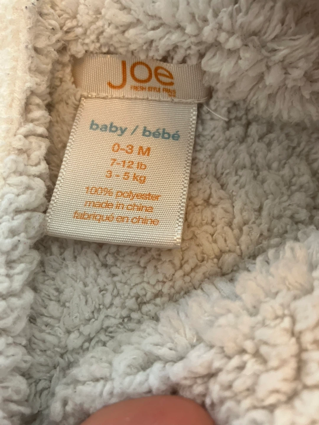 White fleece snowsuit/bunting suit with toggle closures and hood. 100% polyester. Made in China. Fits 0-3 months, 7-12 lbs.