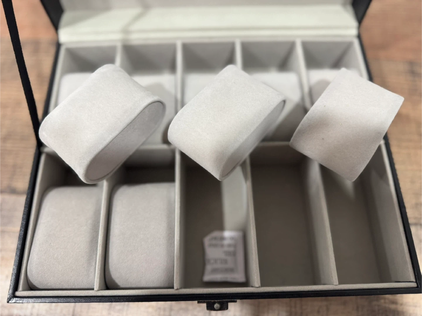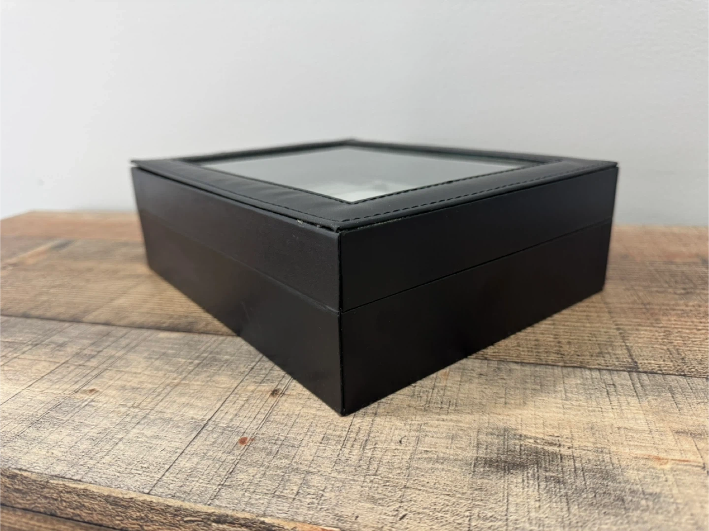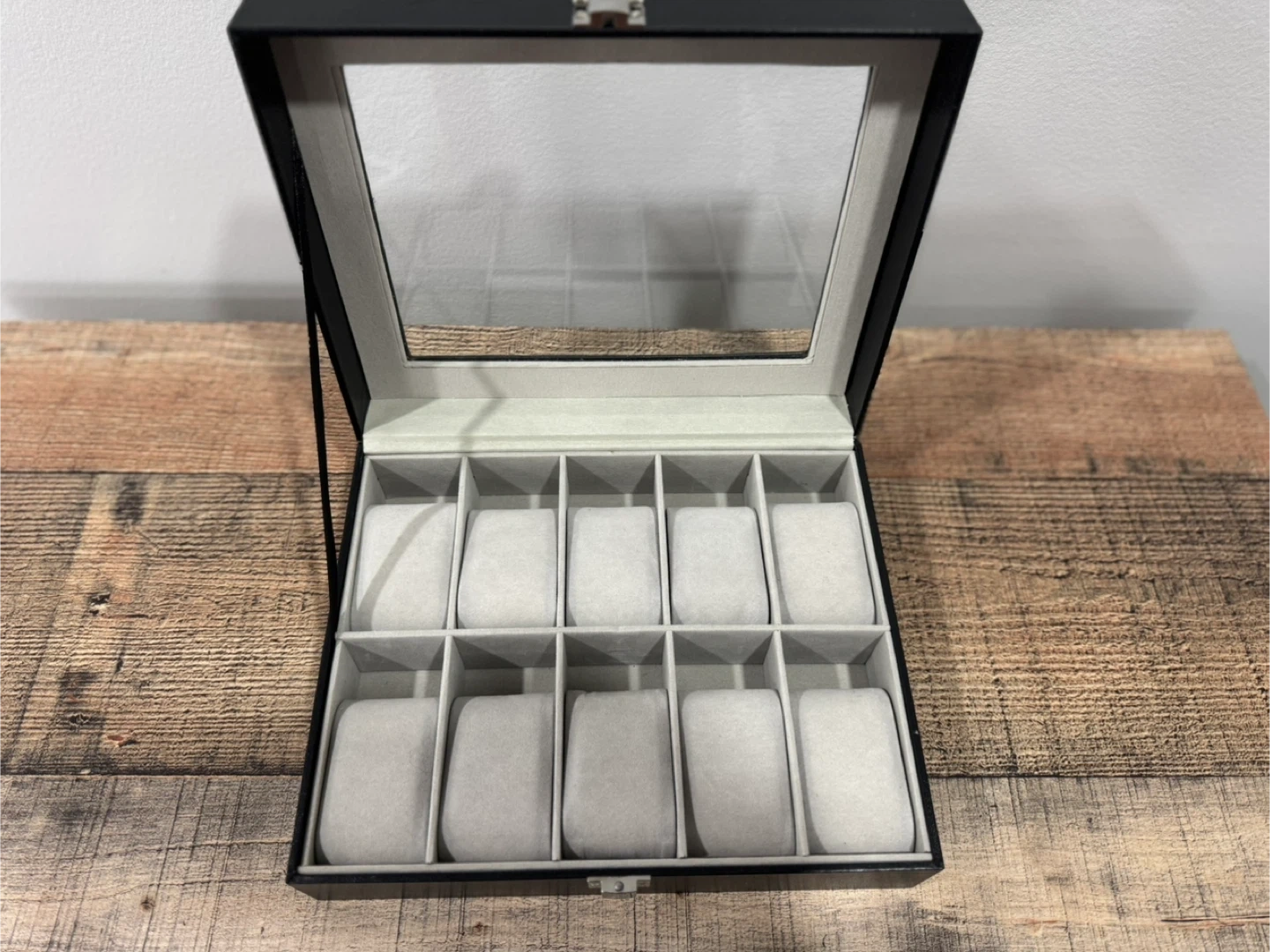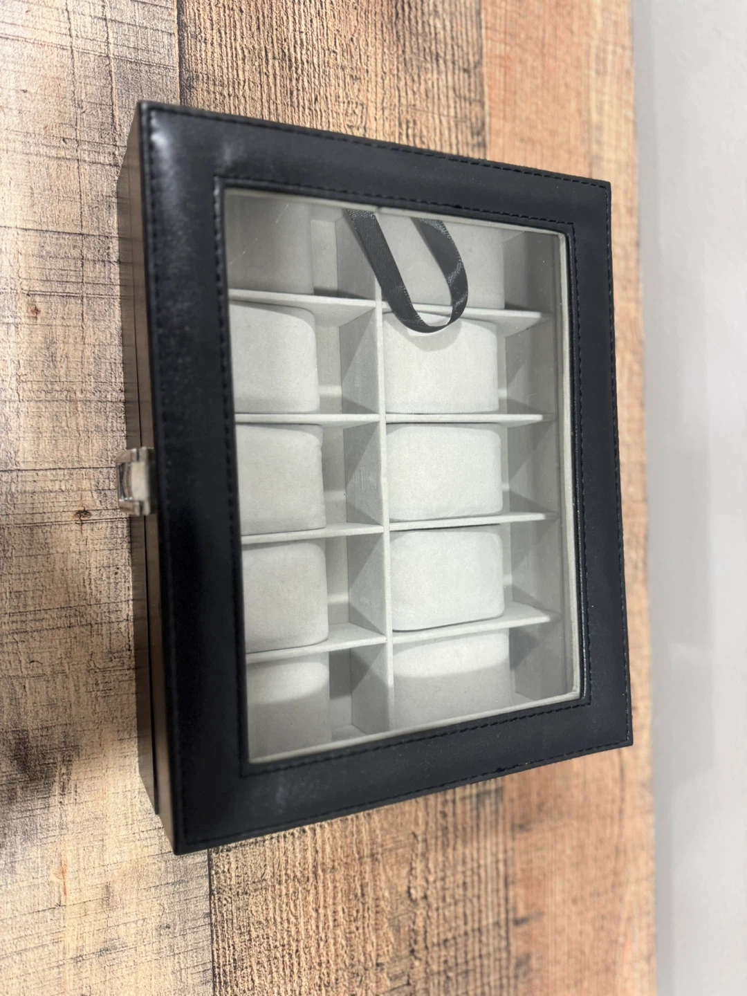 Used black watch display box holds up to 12 watches. It features a glass lid to showcase your collection. The interior has soft cushions to protect each watch. A silver latch keeps the box securely closed.