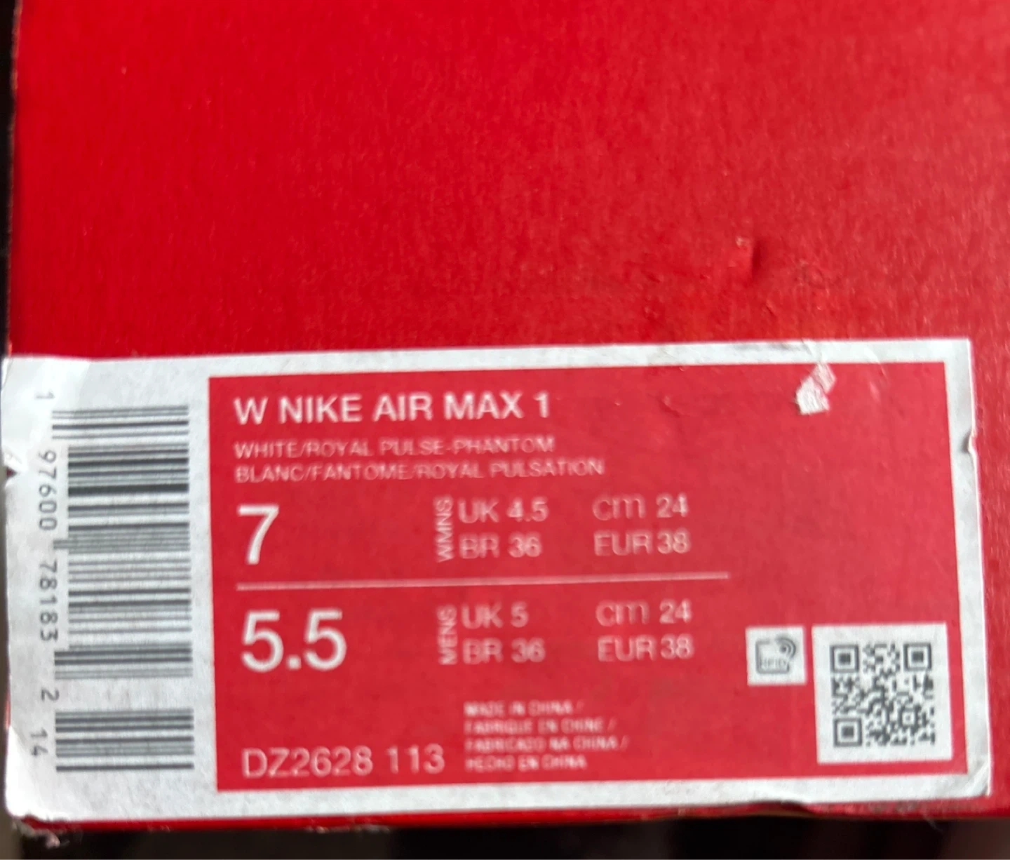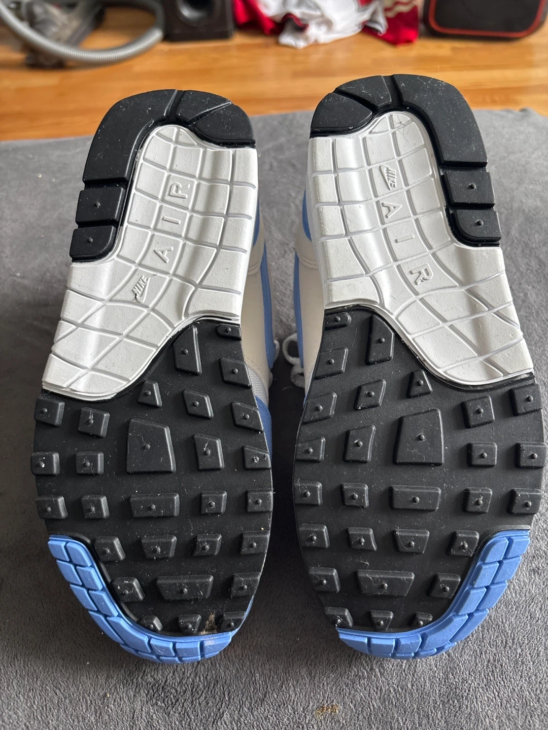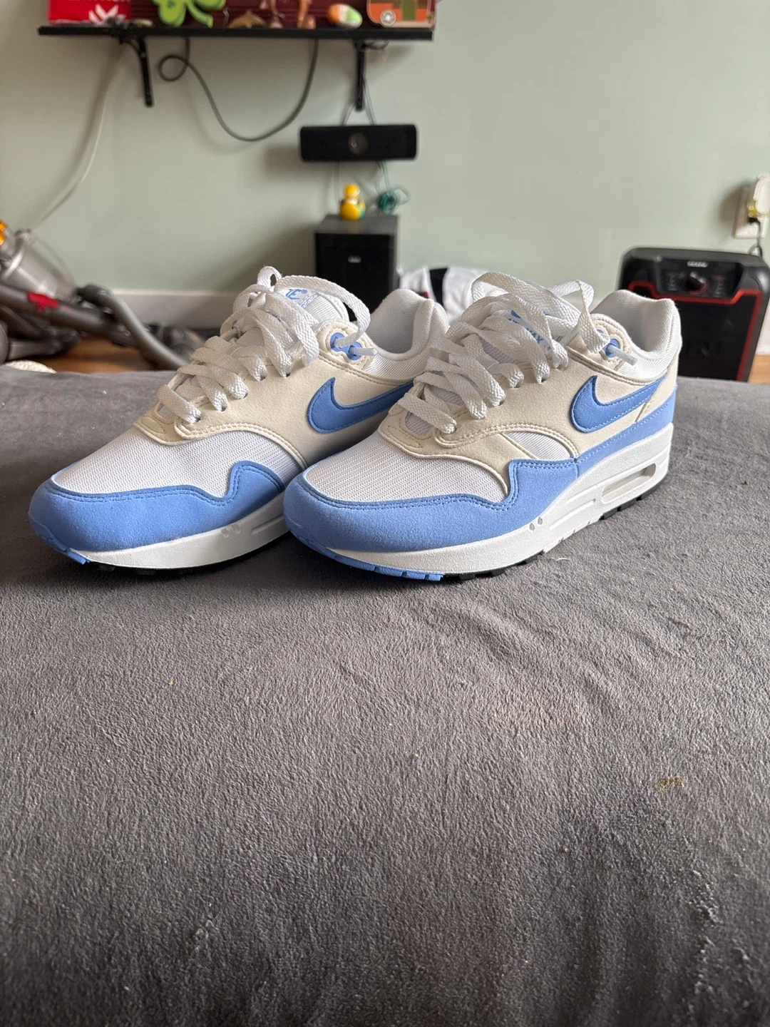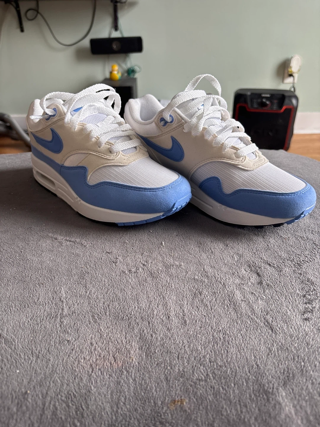 Women's Nike Air Max 1 sneakers in white with royal pulse blue and phantom accents. Features mesh and suede materials. Brand new never worn. Purchased for $120 plus tax.