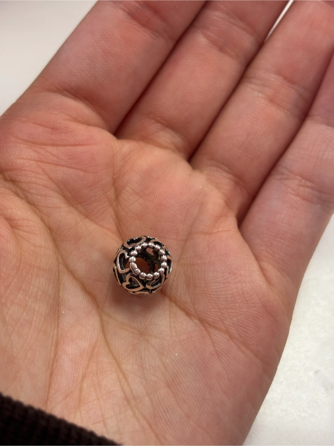 This is a silver-tone charm bead. It features an openwork design with multiple small hearts. The bead's core is black.