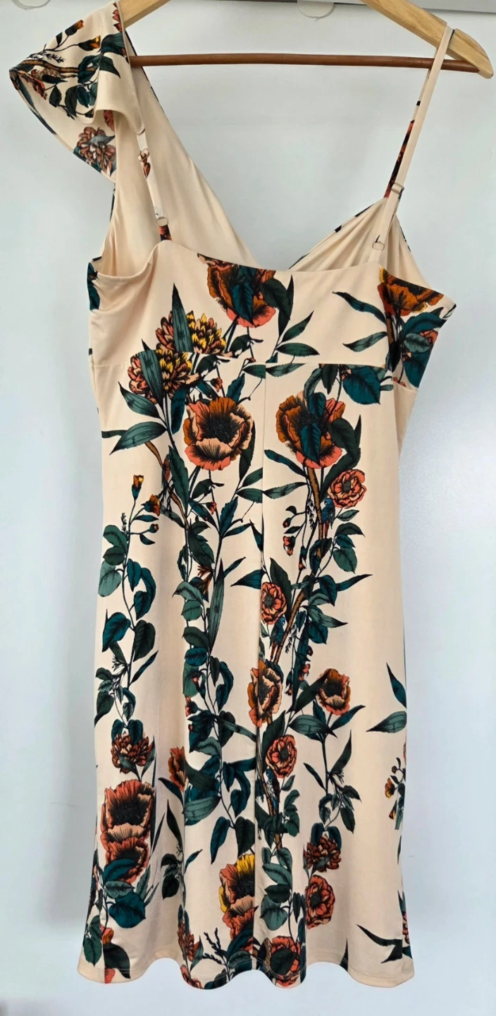 A stylish cream-coloured Guess dress featuring a vibrant floral print. It's designed with a flattering one-shoulder neckline and ruched detailing down the front. This dress is perfect for a night out or a special occasion!