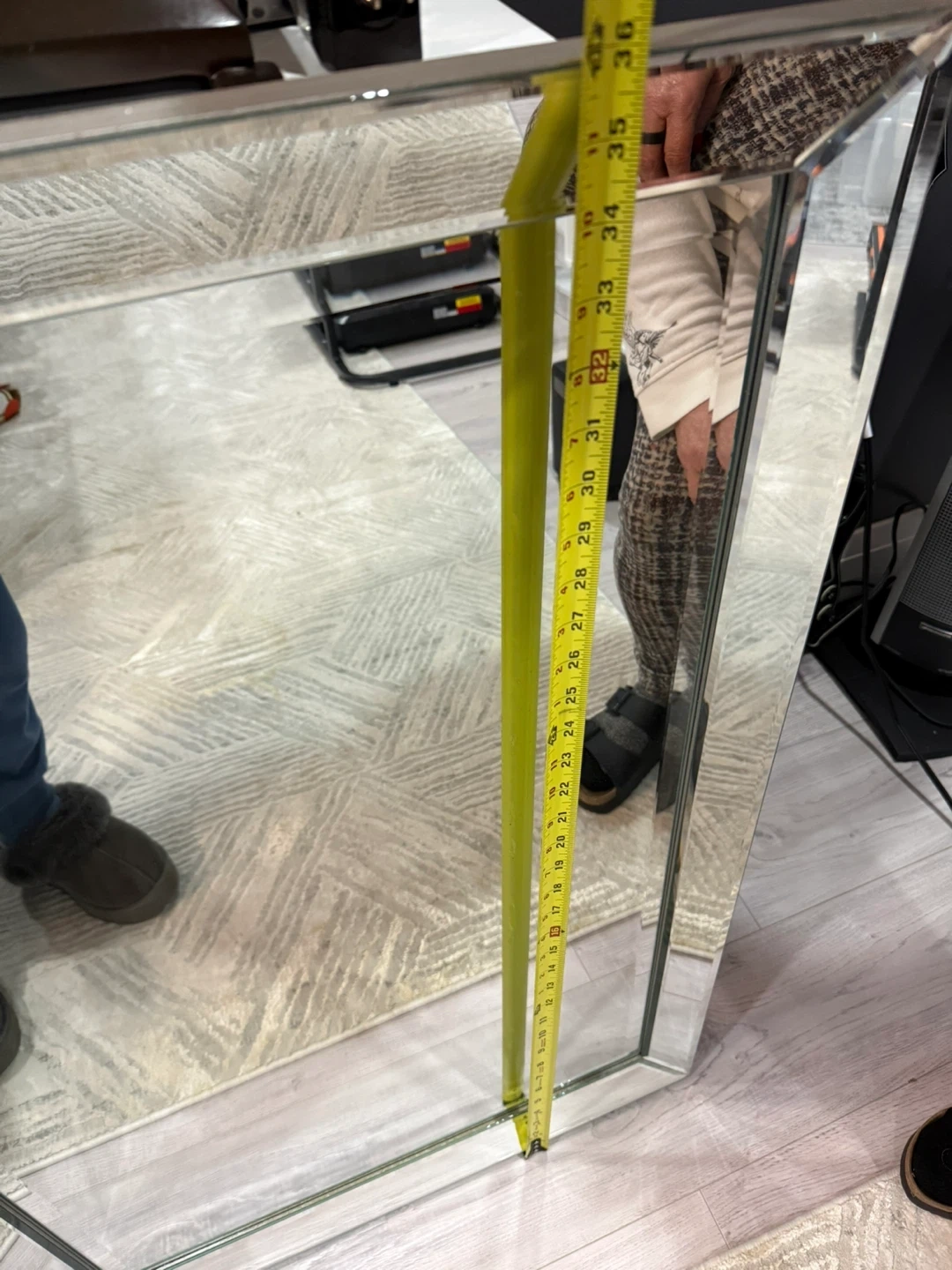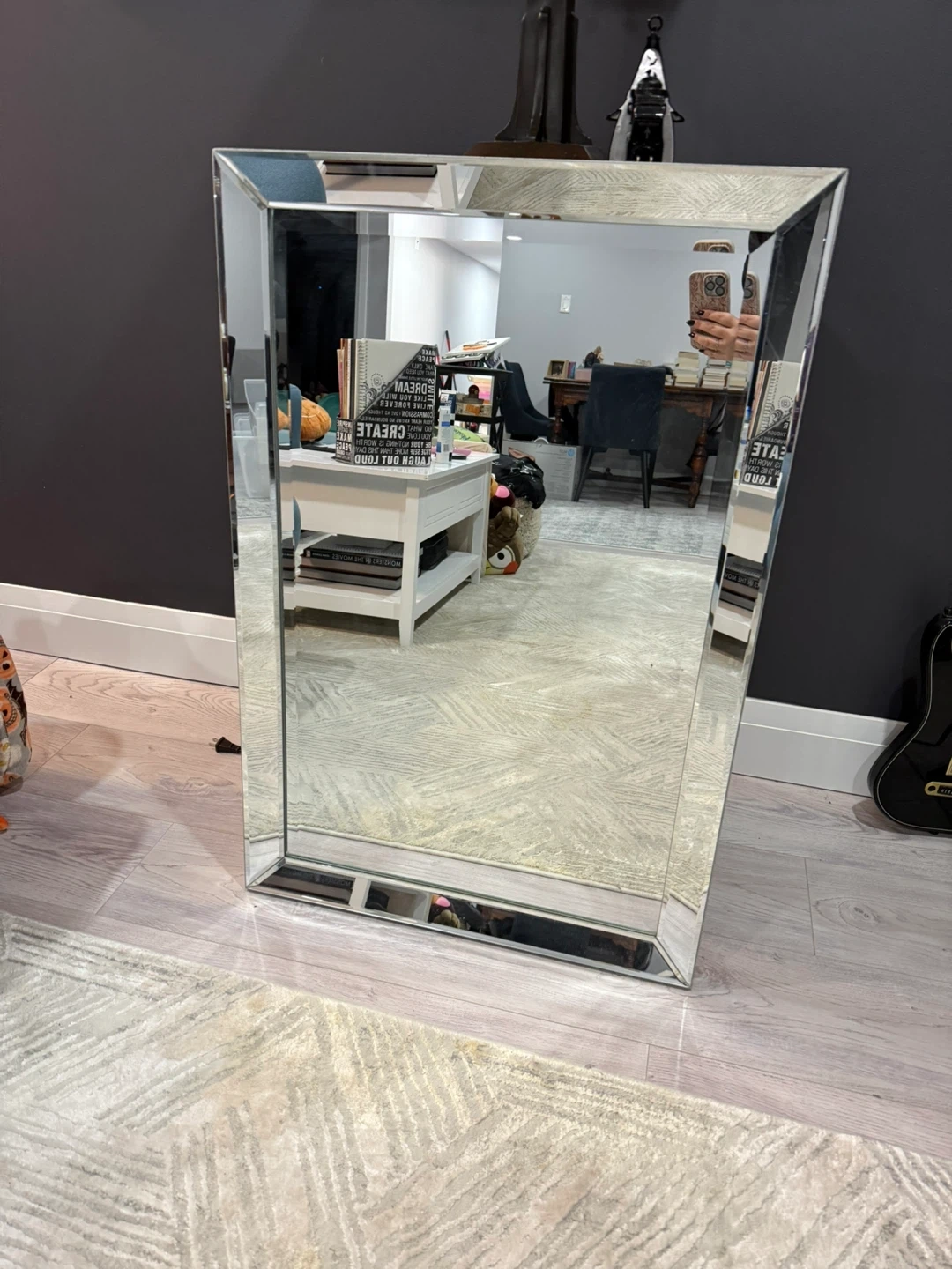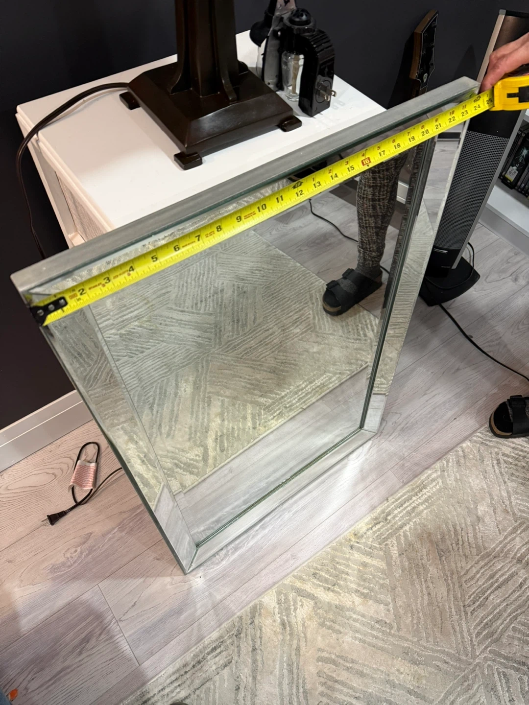 This is a large decorative mirror. It measures approximately 35 inches tall and 23 inches wide. The frame is made of mirrored glass.