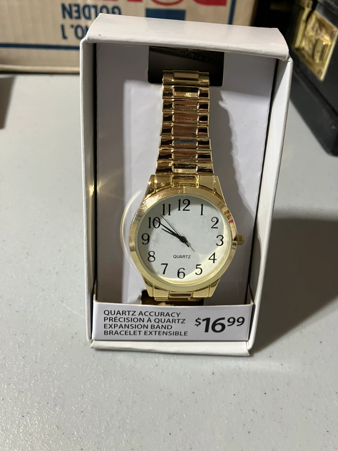 Quartz accuracy wrist watch with an expansion band. It's gold-toned with a white face and clear numerals. The bracelet is extensible.