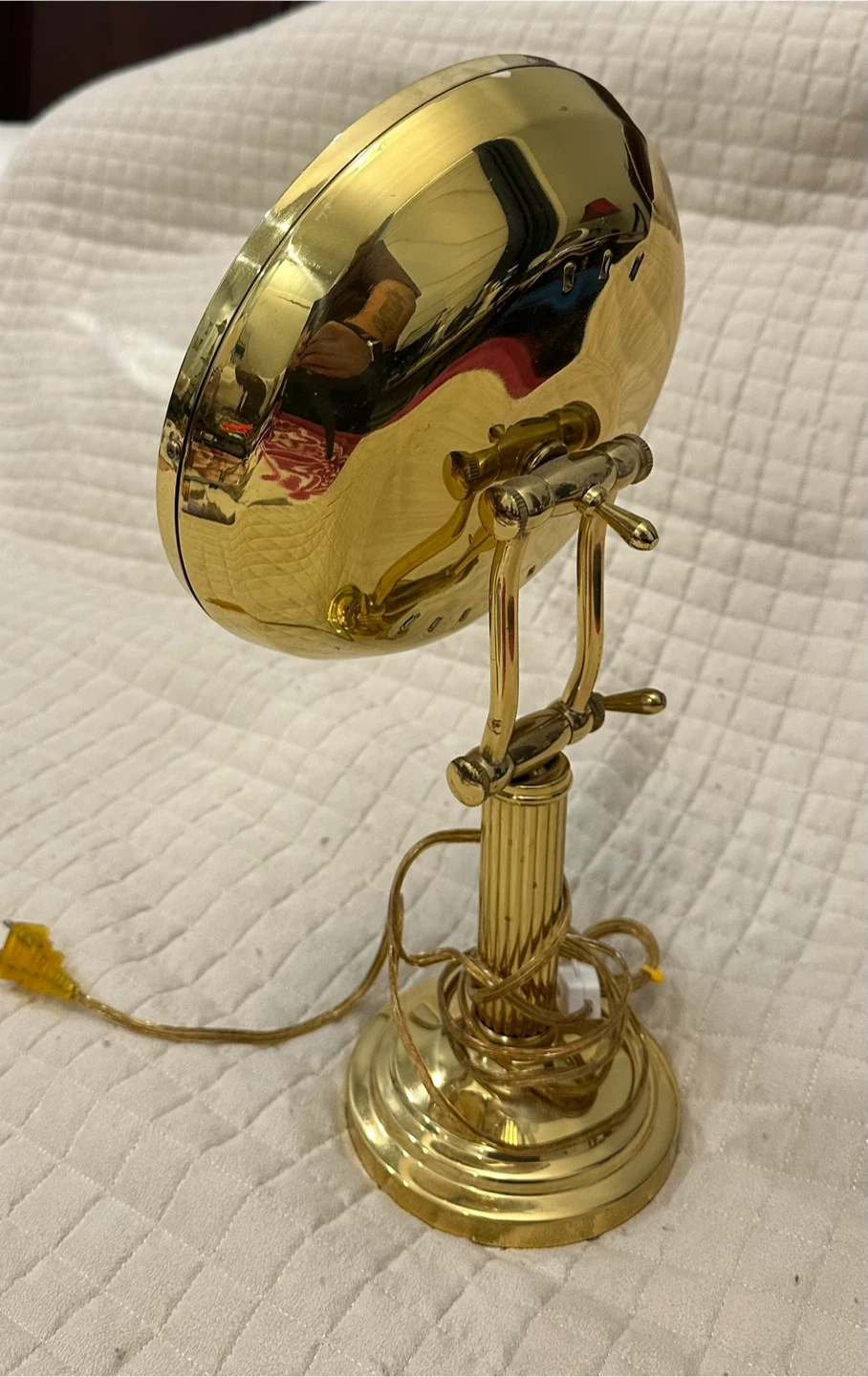 This is a vintage-style gold vanity mirror with a magnifying side. It's perfect for applying makeup or any detailed grooming. The mirror has a polished gold finish and a sturdy base.