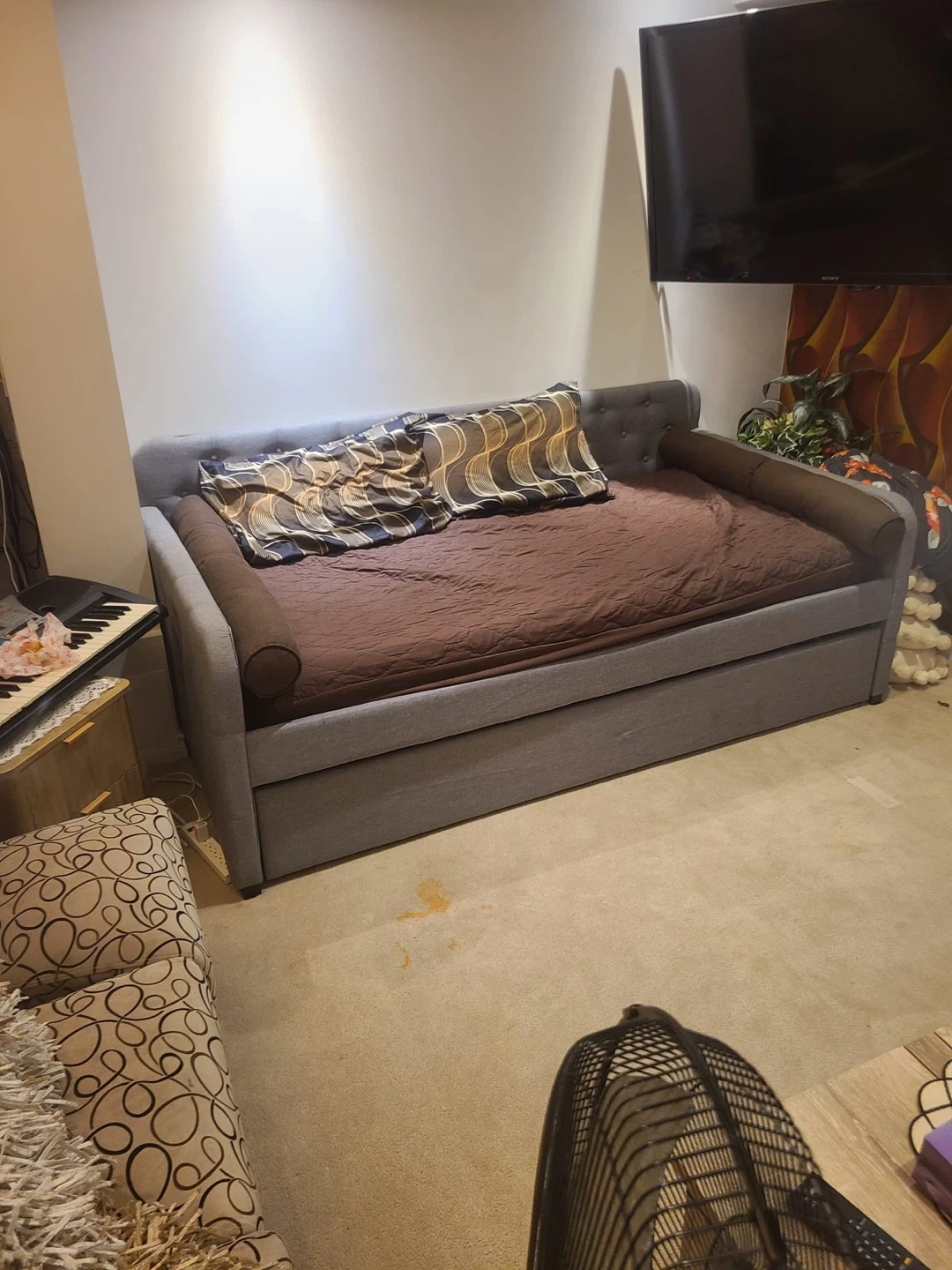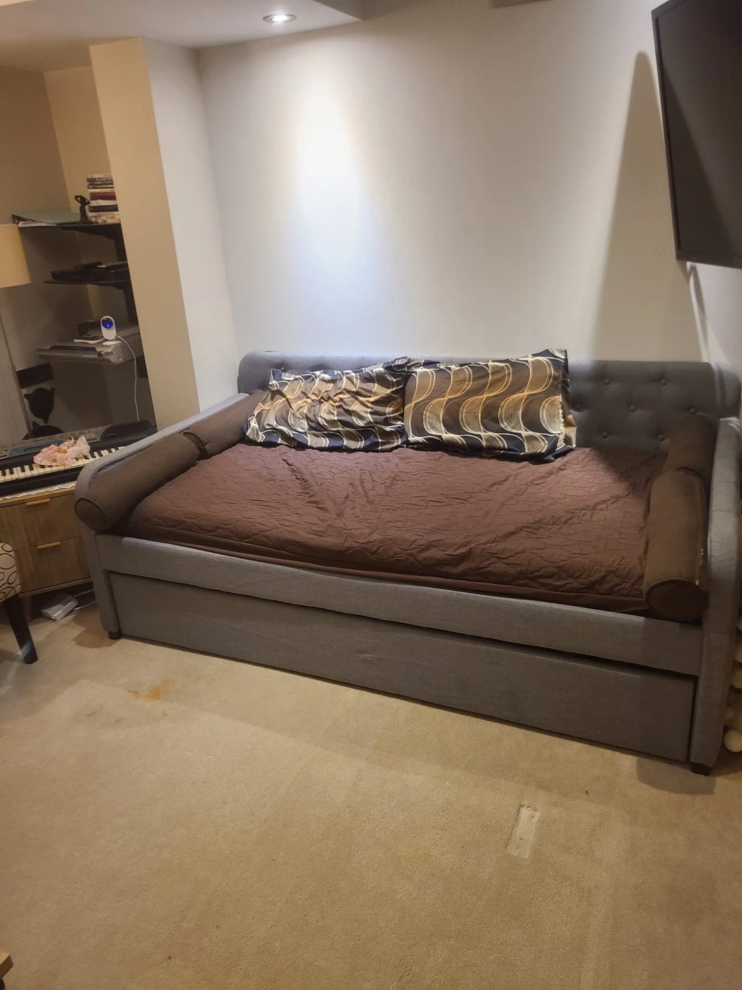 This is a grey daybed with a pull-out trundle, perfect for accommodating guests. It's upholstered in a durable fabric and features a tufted backrest. The trundle slides out easily for extra sleeping space.