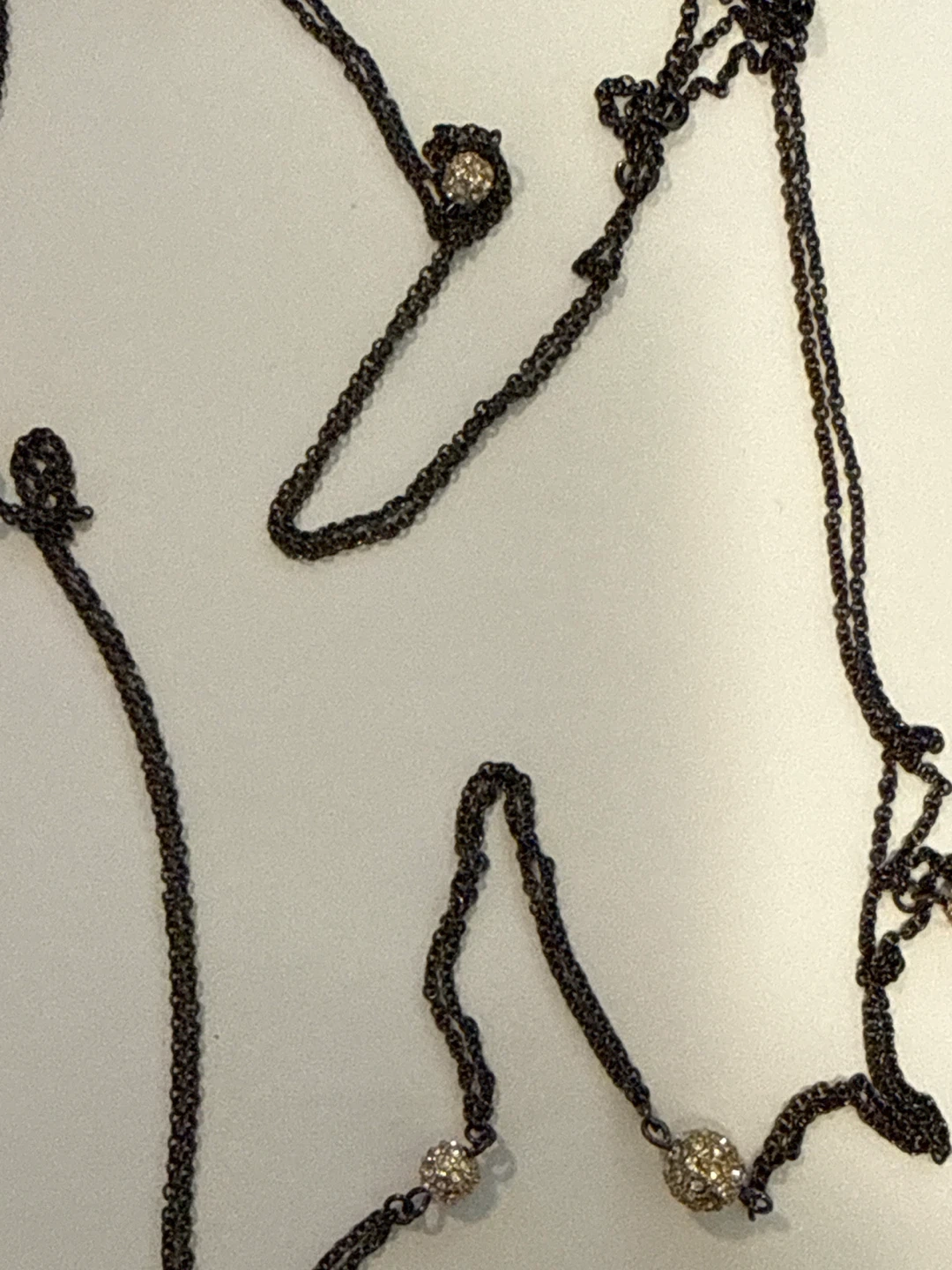 This is a long, dark-toned necklace featuring multiple small balls adorned with diamante accents. The chain has a delicate double-strand design. It's a stylish accessory that adds a touch of sparkle. Perfect for layering or wearing on its own!